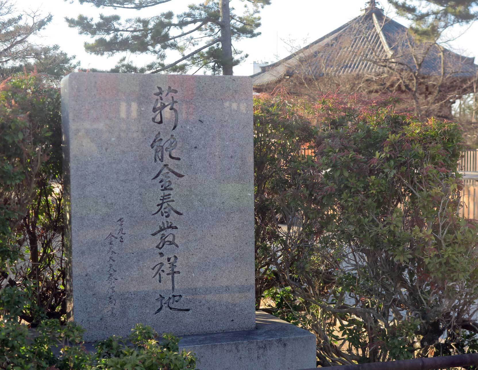 興福寺境内の「薪能金春発祥地」碑興福寺多川寺務老院から能について話を聞く