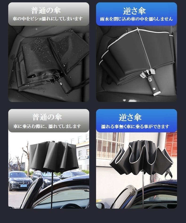 傘を畳むときに服を濡らしたり、車の乗降りの時に濡れたりします。更に社内を濡らしてしまいます。