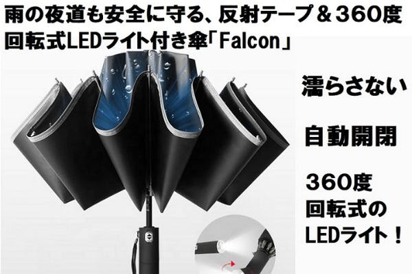 その問題を解決してあなたやあなたの家族をお守りするのが、今回ご紹介する360度回転式LEDライト搭載折り畳み逆さ傘「Falcon」です。