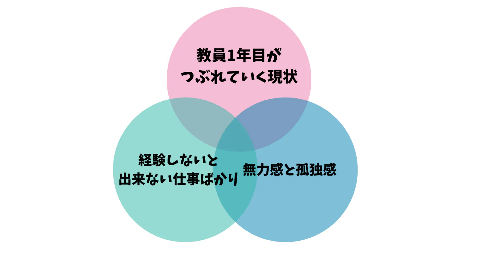 わたしたちは、多くの同期が教員を辞めていく姿を見て、なんとかしなければいけないと思いました。わたしたちが1番苦しかった教員1年目の1学期に、想いのある若手が「本当に欲しかった研修」「必要としていた場」を作ることにしました。