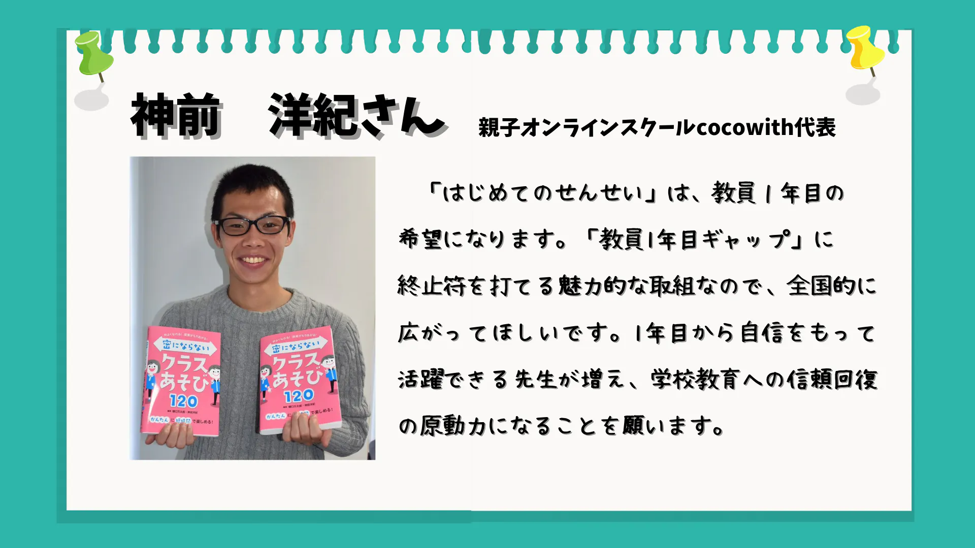 プロジェクト採択図書「密にならないクラス遊び」著者の神前洋紀氏×まなびぱれっと特別コラボ 勉強会にご招待します!若手教員が絶対学級崩壊しないための研修を行います!管理職や指導教員の方も必見!