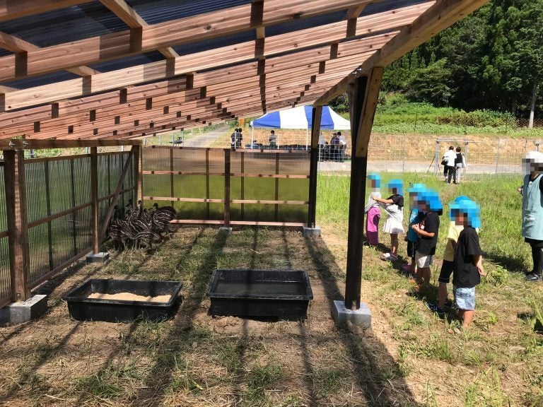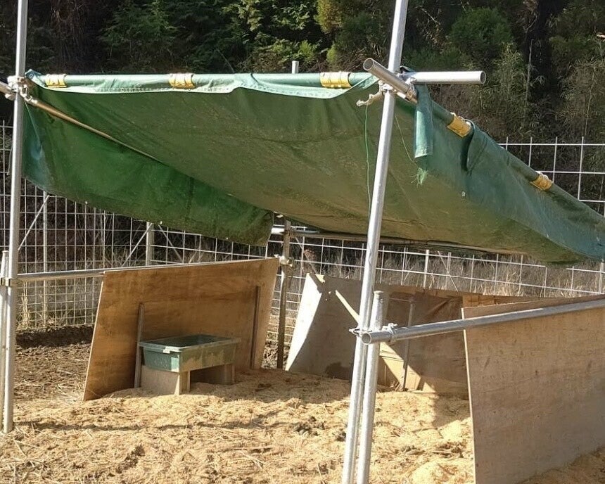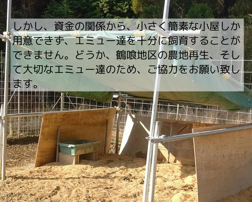 試験飼育4羽用の小屋。エミューたちには雨風をしのげる施設を与えたい鶴喰なの花村のこれまでの活動