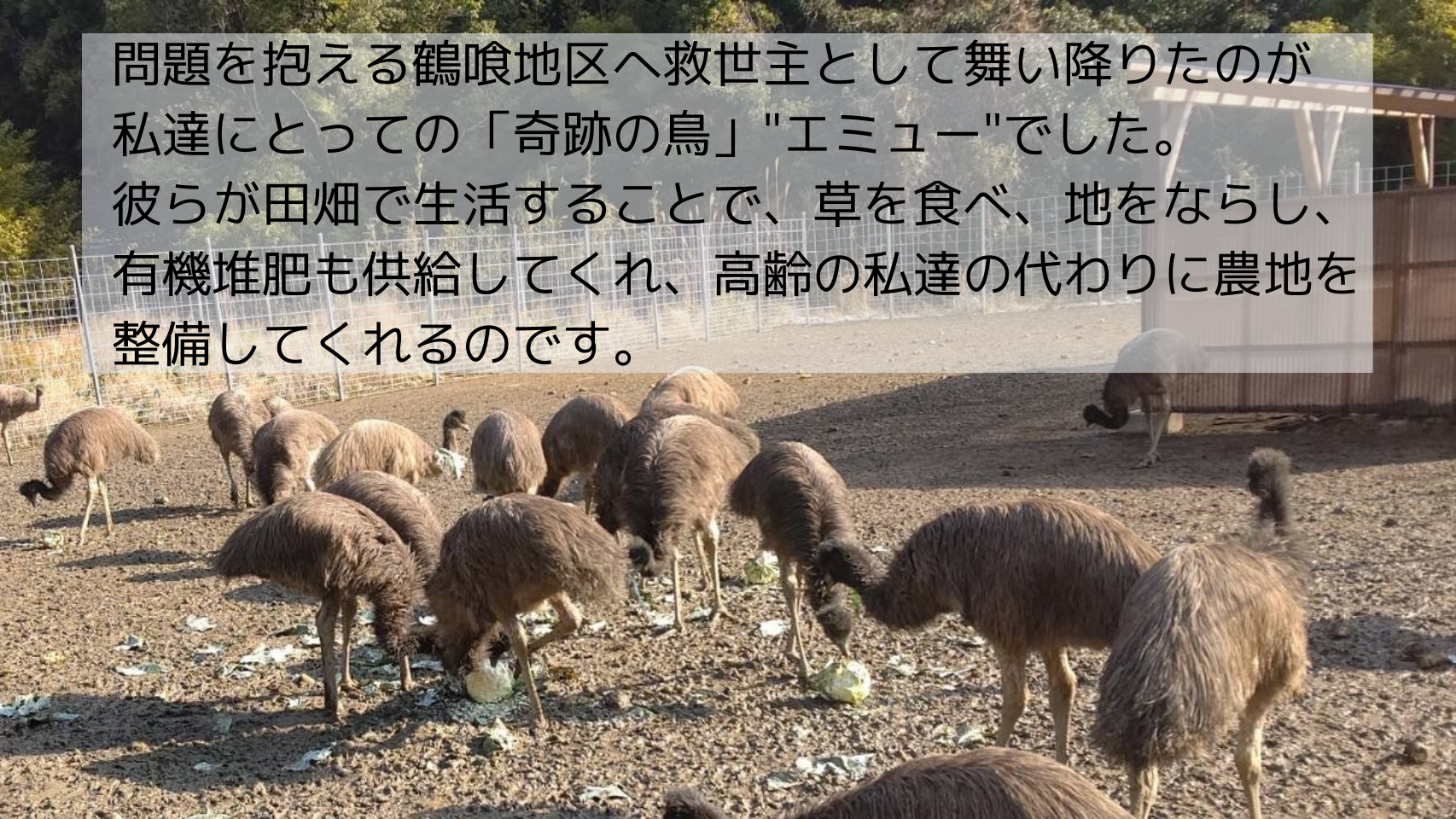 エミューの飼育を本格的に始めて分かったことは、中山間地域の集落にとって極めて有効であるということです。