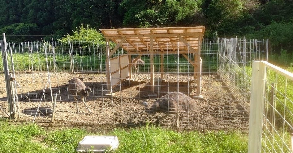 午後、裏山ではアブラゼミの鳴き声がしきり。日射し、空、セミの声。夏の盛りの一日でしたが、皆様のおかげでエミュー達は日差しにさらされることなく、時折小屋の日陰に入って過ごしています。