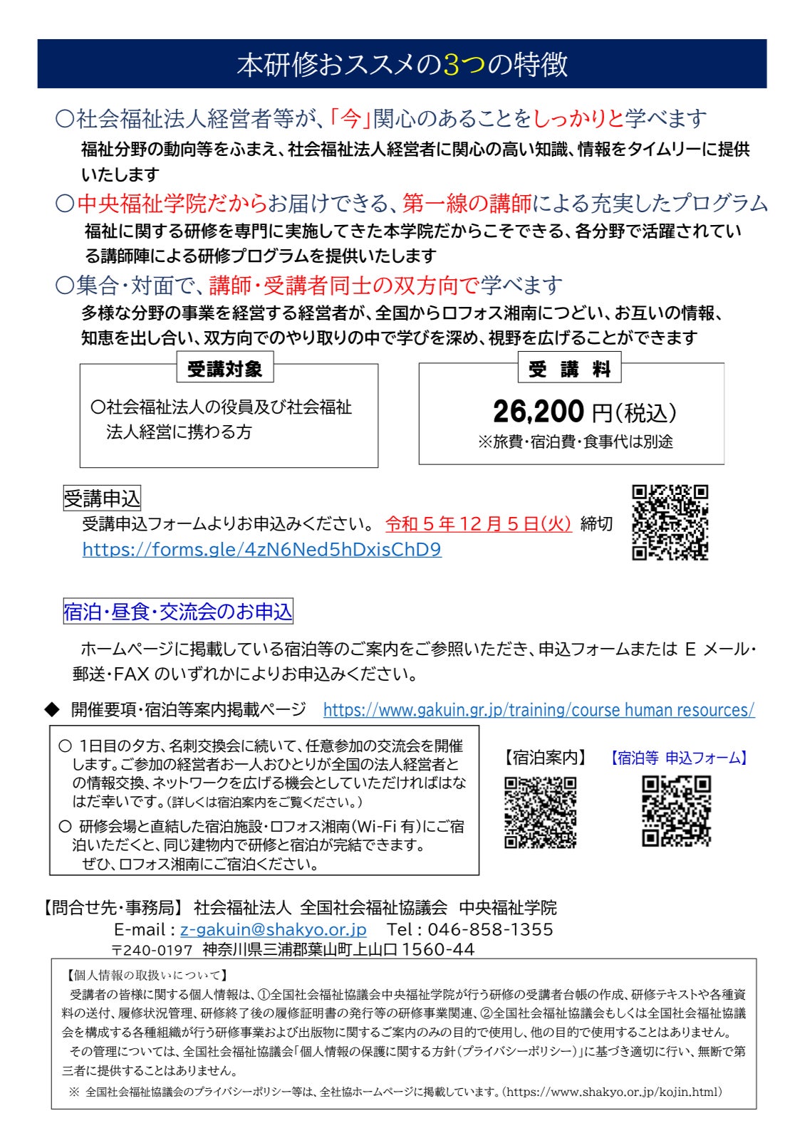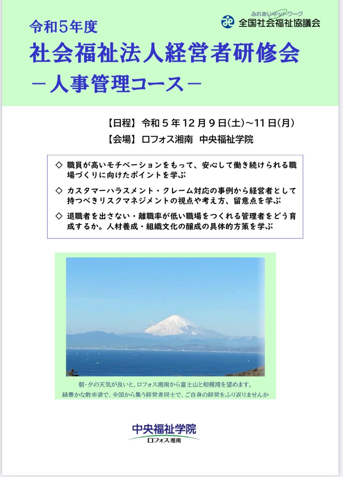 全国の社会福祉法人の経営者や施設長が例年100名近く集まる12/9〜12/11の3日間研修です。