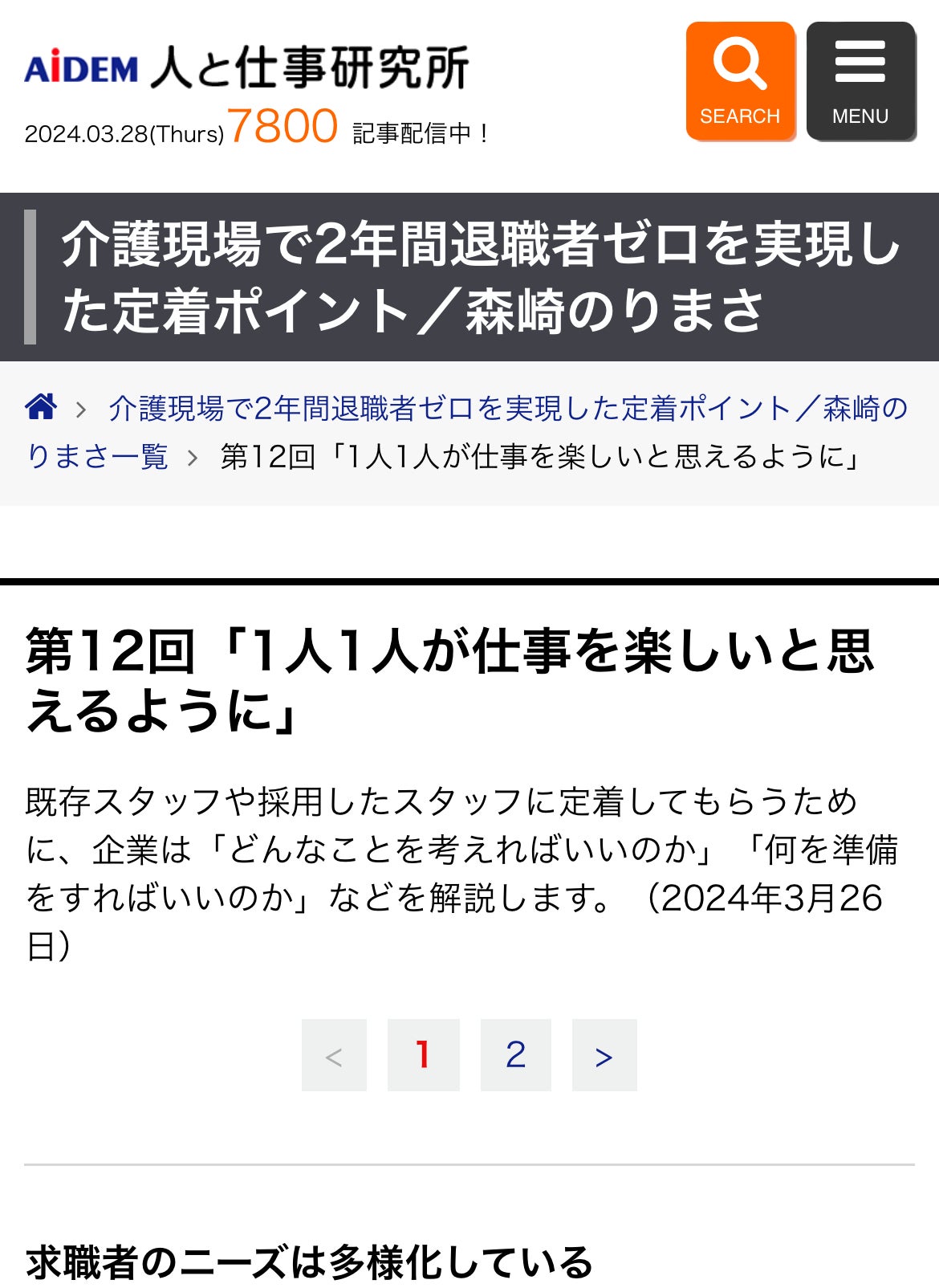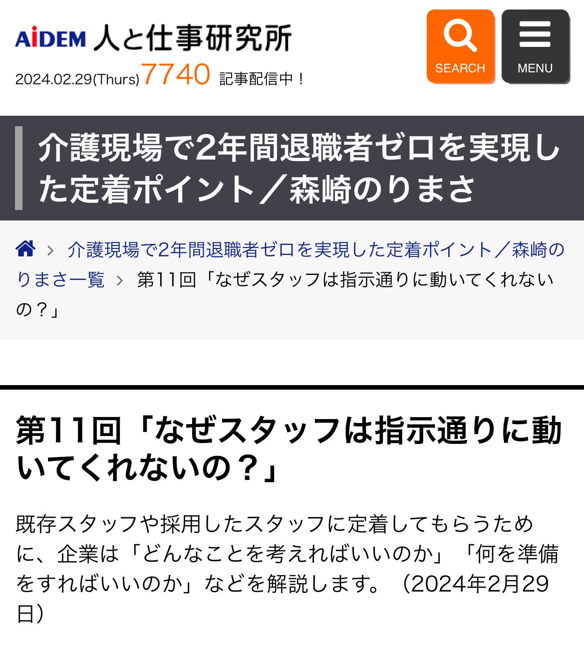 こんばんは!『退職者を出さない管理者が必ずやっていること』と『介護現場のコンプライアンス ケーススタディ』の著書、森崎のりまさです。ついに最終回です!毎月1記事を書いています求人広告会社の大手老舗であるAiDEMさんのサイトで、私の連載記事第12回目が先日掲載されました記事はコチラをクリック!一年前、AiDEMさんから年間の連載記事執筆のご依頼をいただきまして、正直12回連続で記事を書き続けられるか不安はありました。ですが、「このようなありがたいご依頼を断るなんてもったいない!」との思いで覚悟を決めて引き受けました。その間に講演会や研修、新しい書籍の執筆などなど、記事の締め切りに間に合わなくなるような事態が定期的に起こっては、追い詰められる日々を送りました…ですが、そんな中でも編集担当者さんは私の記事を楽しみにして待っていてくださるんですそして、書き上げた記事をすぐ読んでくださり、面白かった部分や自身の気づき、発見などをいつも話してくださっていつも救われるような気持ちでした★おかげで、なんとか期限に間に合わせながら書き続けることができました!編集担当の方には本当に感謝でございます!1年間、楽しいお仕事でした!本当に感謝です!ありがたやー