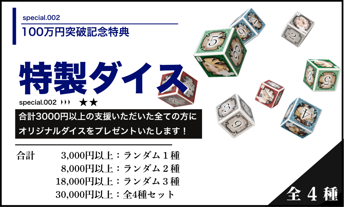 2022/09/10 20:43この度は、大変多くのご支援をいただき誠にありがとうございます。皆様のおかげ様で今回のプロジェクトを目標金額を大きく上回って無事に終えられました。今後、製造を進め、ご支援者さまの皆さまへ、順次リターンの対応をさせていただきます。詳細等はあらためてご案内いたしますので、引き続きどうぞよろしくお願いいたします。 もっと見る【感謝!特製ダイス追加します!】目標金額の100%突破いたしました!!!
