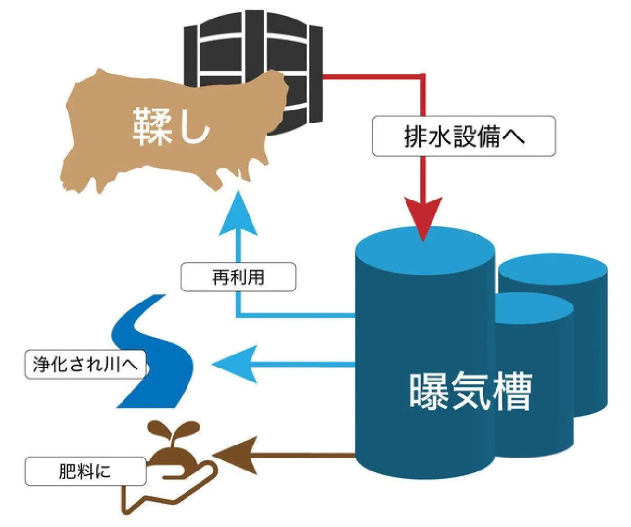 最終的に浄化された水の3分の1は原皮洗いに再利用され、それ以外は近くの河川に戻されます。