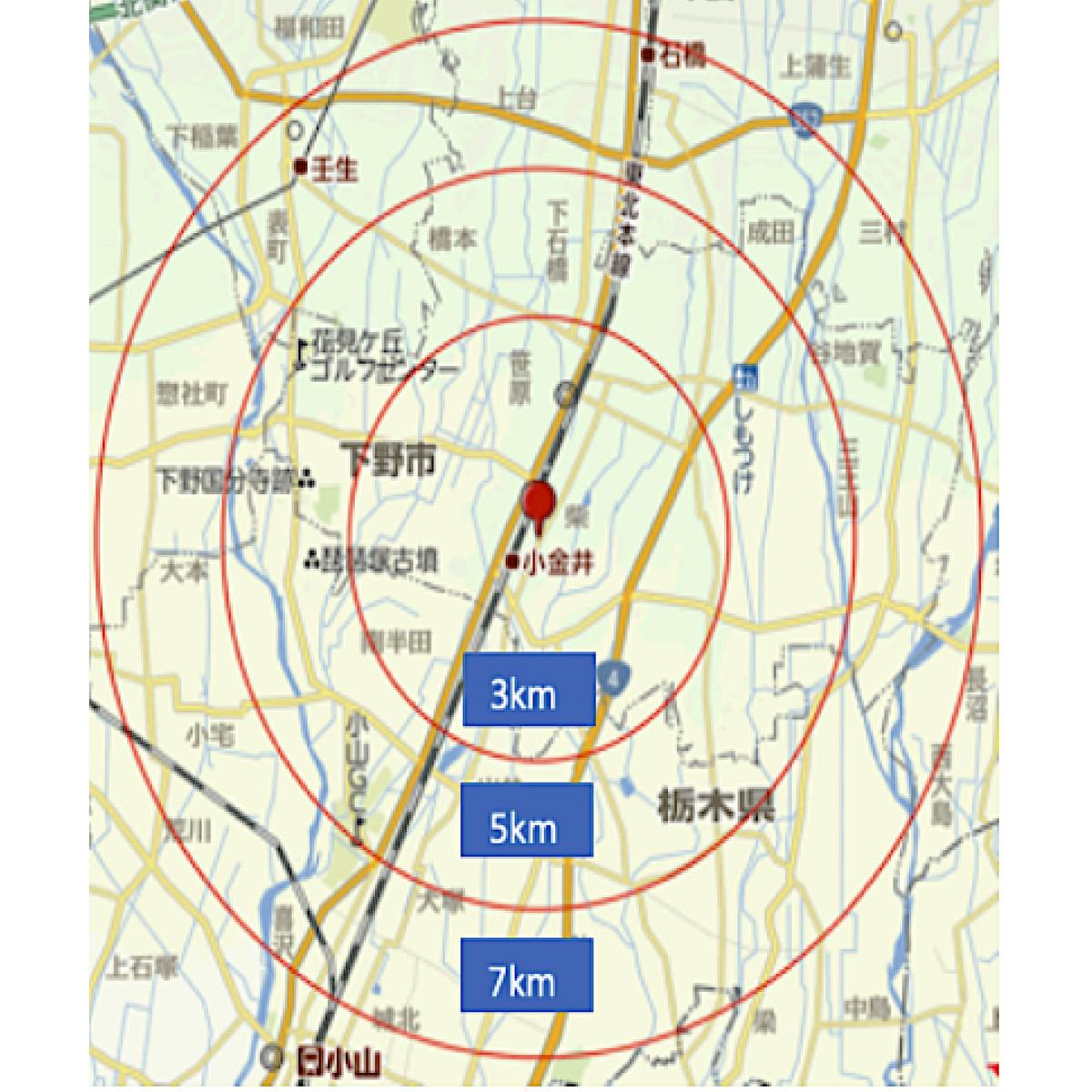 7km圏内だと石橋エリア、小山駅周辺まで波及します。