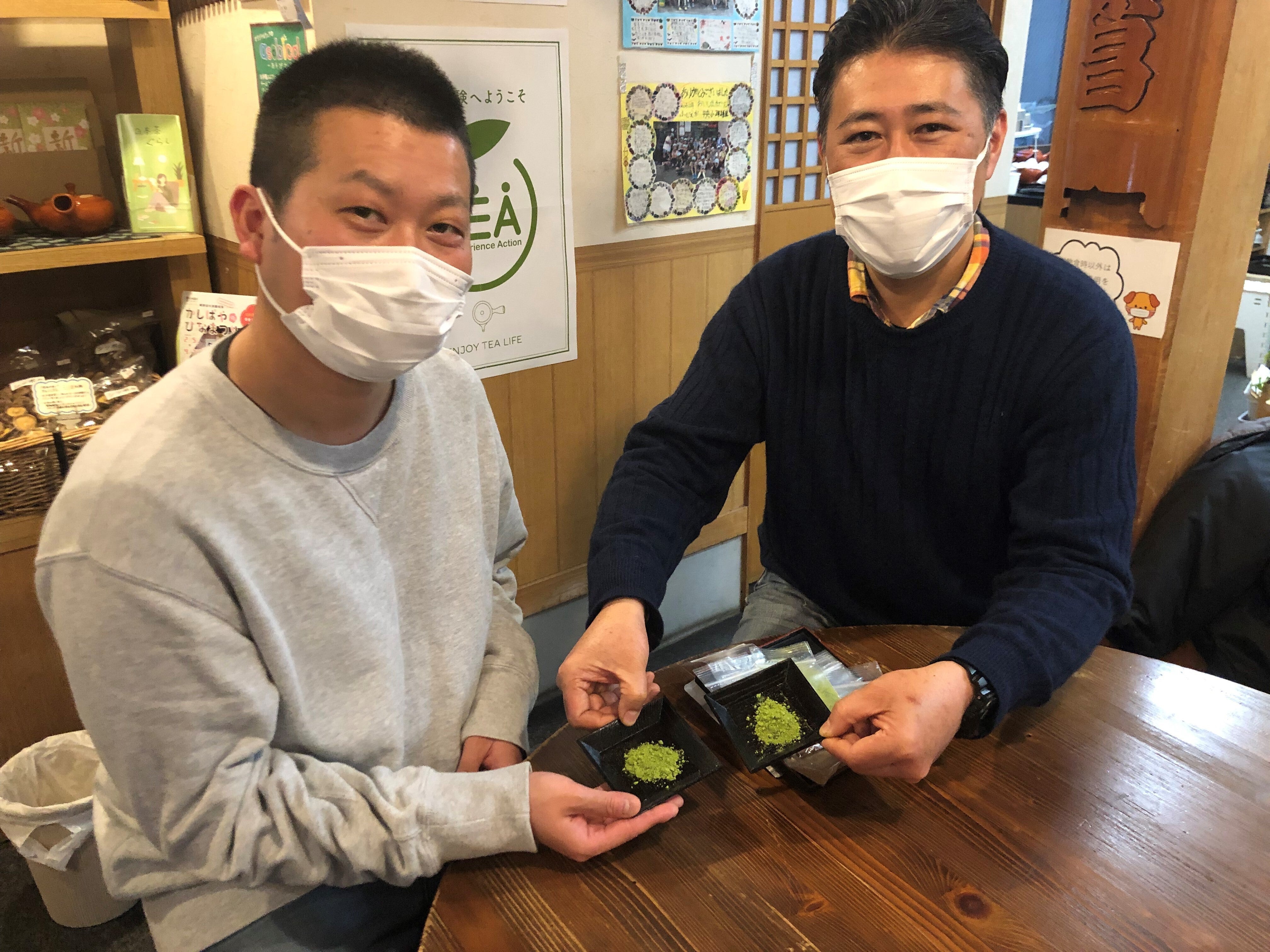 まるか村松商店にて、村松さんと抹茶を選定中の様子静岡県藤枝市を含む志太地域では、遅くとも江戸時代にはお茶が作られていました。
