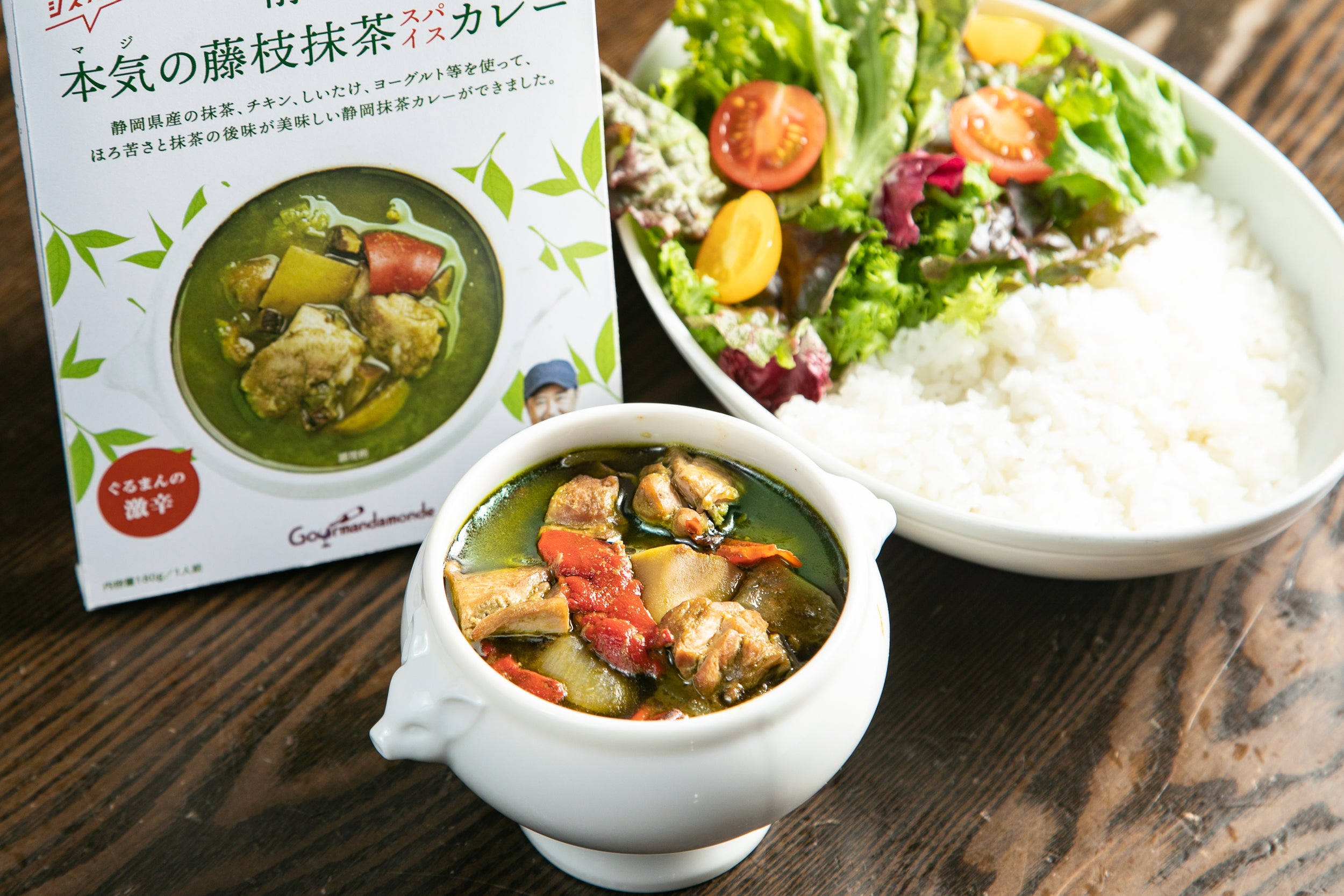 もう一つは、消費減少傾向の課題を抱える静岡特産物のお茶の販売促進に取り組む方とのご縁から、ご紹介頂いた「藤枝茶」。これを使用した「静岡抹茶スパイスカレー」開発に取組んでいます。
