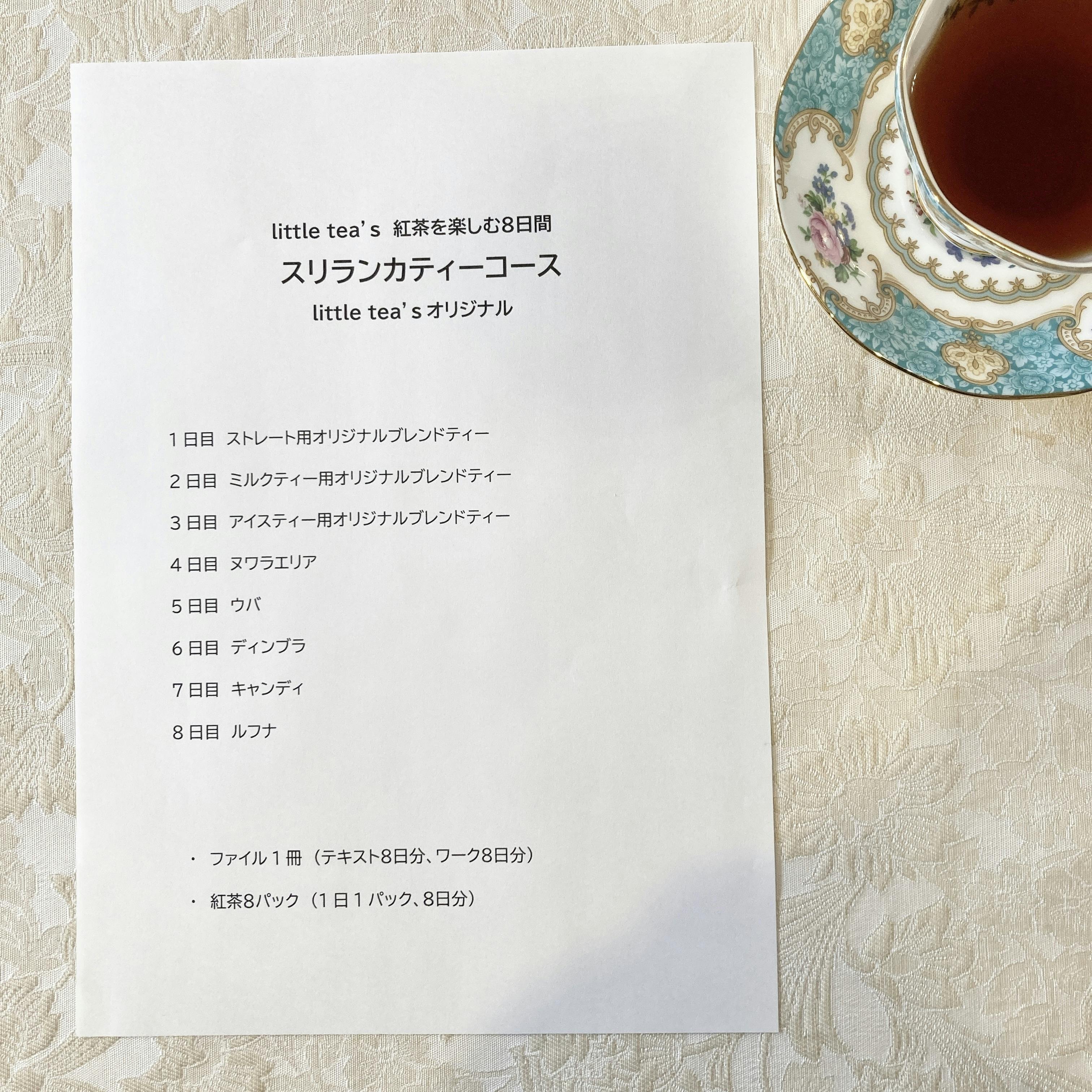 紅茶について学ぶプログラム7日間分のテキスト(A4/19ページ)、ワーク、オリジナルティーを含む紅茶をお届けします。