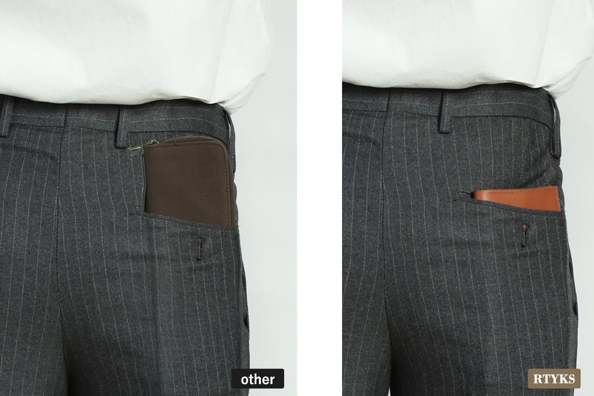 一般的な長財布のように後ろポケットに入れた時に飛び出してしまったり