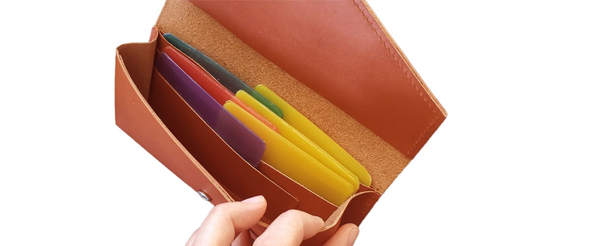財布を開いけばすぐにカードが見つけ出せる、斜めにカットされたデザイン