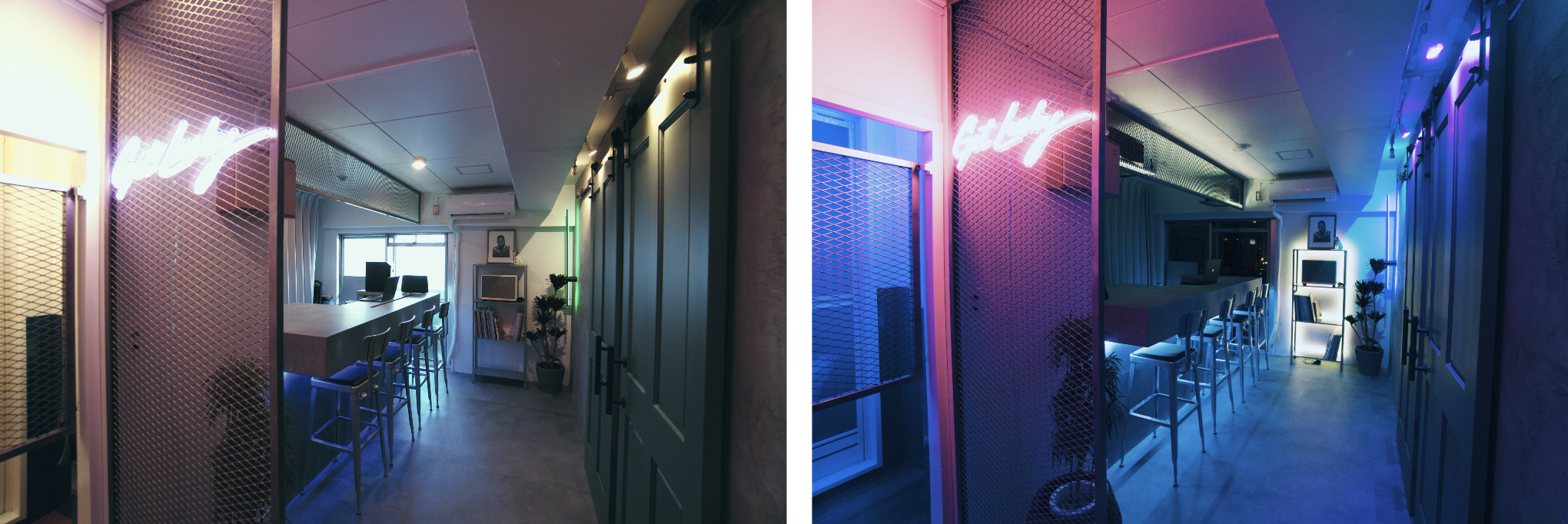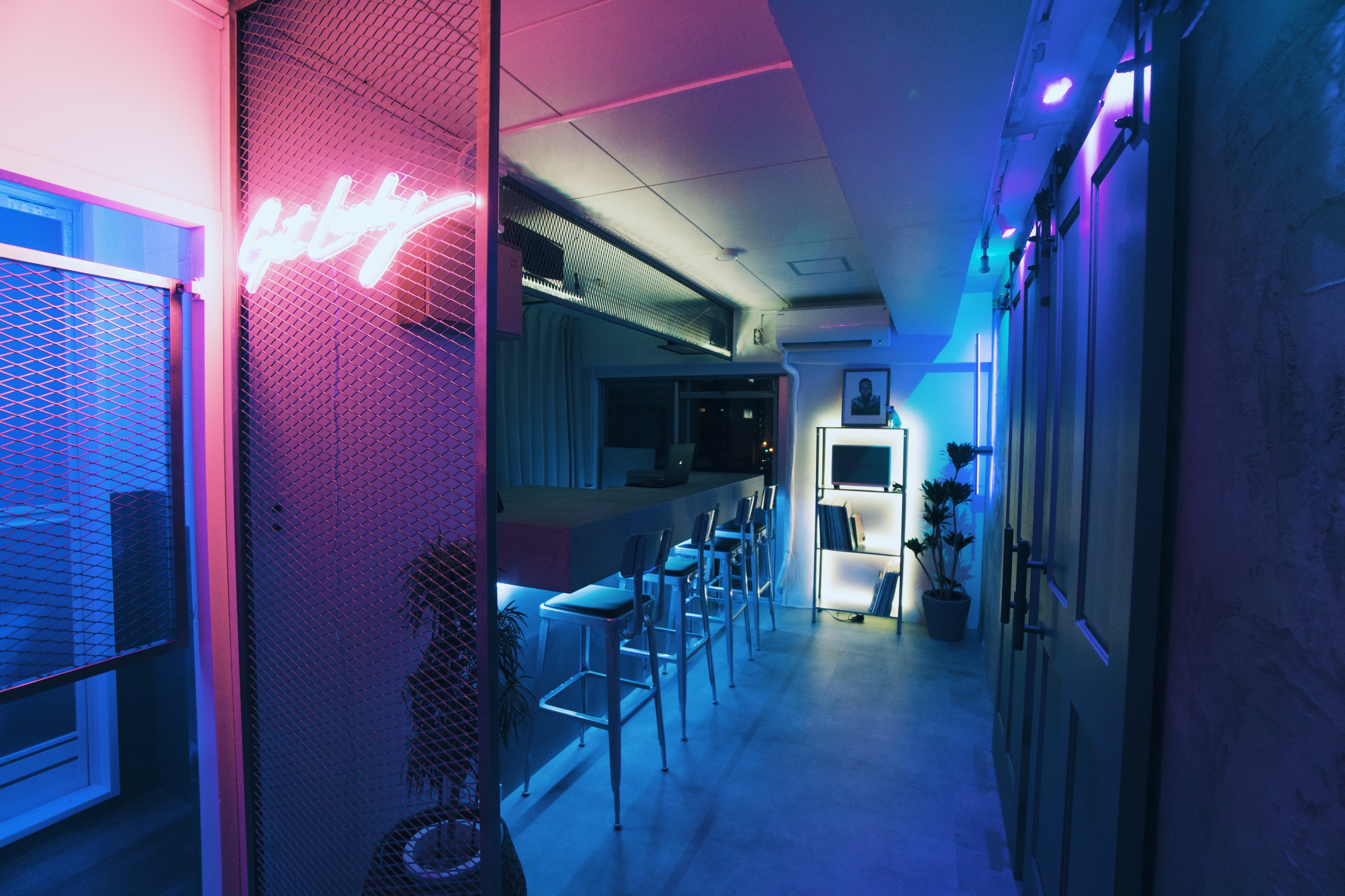 脱毛サロンもバーバーショップやレコードショップのように流行に敏感なおしゃれな人が集まる場所にしたい。お洒落で落ち着いたHipHop/R&B/Soulが流れていて、通っていて落ち着くような、フラッとお店にお足を運びたくなる様な全く新しい空間を提供したい、そのような気持ちから、空間に徹底的にこだわりました。お店の顔にもなるようなカウンターはバーカウンターになっており、DJブースも併設しております。