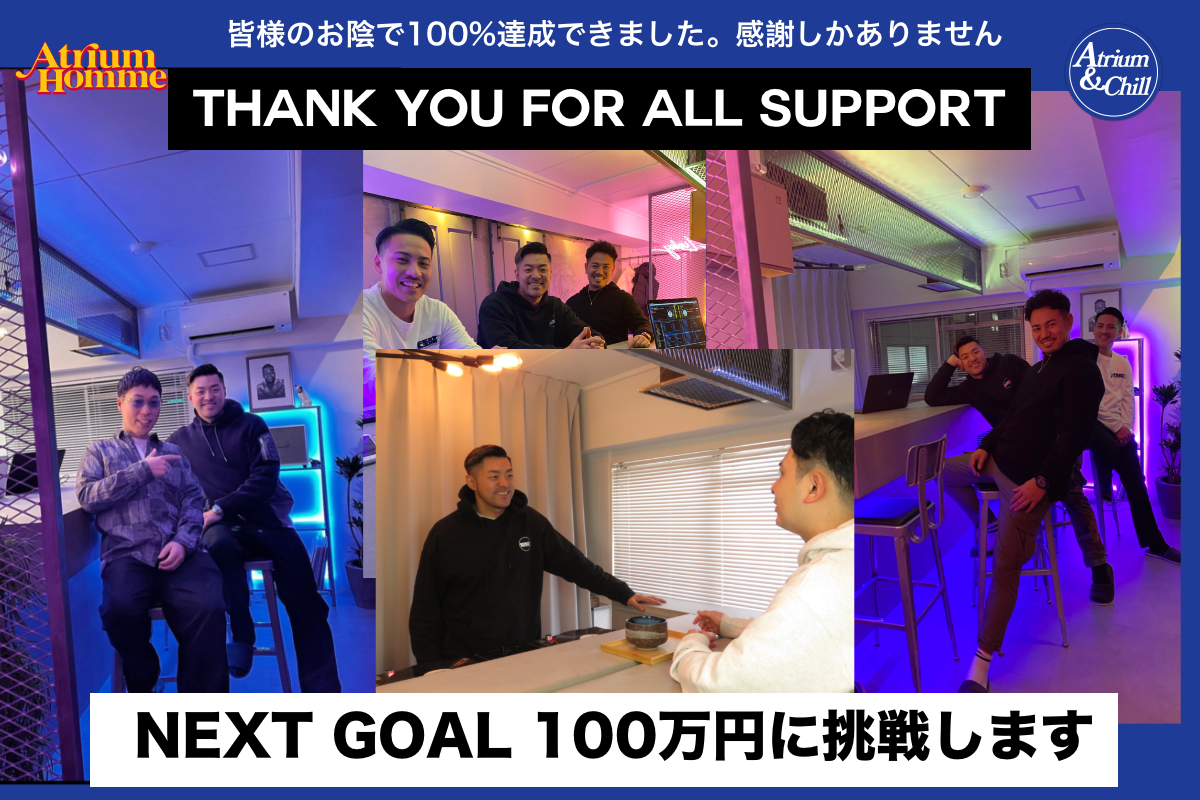 KROです。まず始めに皆様のおかげで、第一の目標であった60万円をこんなにも早く達成することができました!本当にありがとうございます。まさかこんなにも早く、こんなにも沢山の方に応援して頂き感謝しかありません。そして毎日、嬉しいメッセージやインスタグラムでのリポスト、シェアにもとても励まされています。今は友人達を招きサービス向上のためにアドバイスを頂いております。そしてオープンまで脱毛やサービスについて日夜研究をしておりますこのままクラファンの沢山の方の応援を糧に、もう一踏ん張りしたいと思っております。ですので、折角ですからネクストゴール設定目標:達成率160%、100万円に挑戦させて頂こうと思っております。諦めずに最後まで頑張ります!引き続き、私のプロジェクトのシェア・拡散にご協力していただければ幸いです。また支援して頂いた皆様での感謝のメッセージ、DMは全てプロジェクト終了後に返させて頂きます。※リターンについて、もしわからないことなどあればインスタグラムにてDMしていただればお答えいたしますので、よろしくお願いいたします。最近Atrium Hommeのインスタグラムも始めましたので是非FOLLOWもよろしくお願いたします。https://instagram.com/atrium_homme_ebisuそれではクラウドファンディング終了まで駆け抜けます。DJ KROこの活動報告が気に入ったら、シェアしてみませんか?FacebookでシェアするTwitterでシェア活動報告の一覧を見るプロジェクトを見る