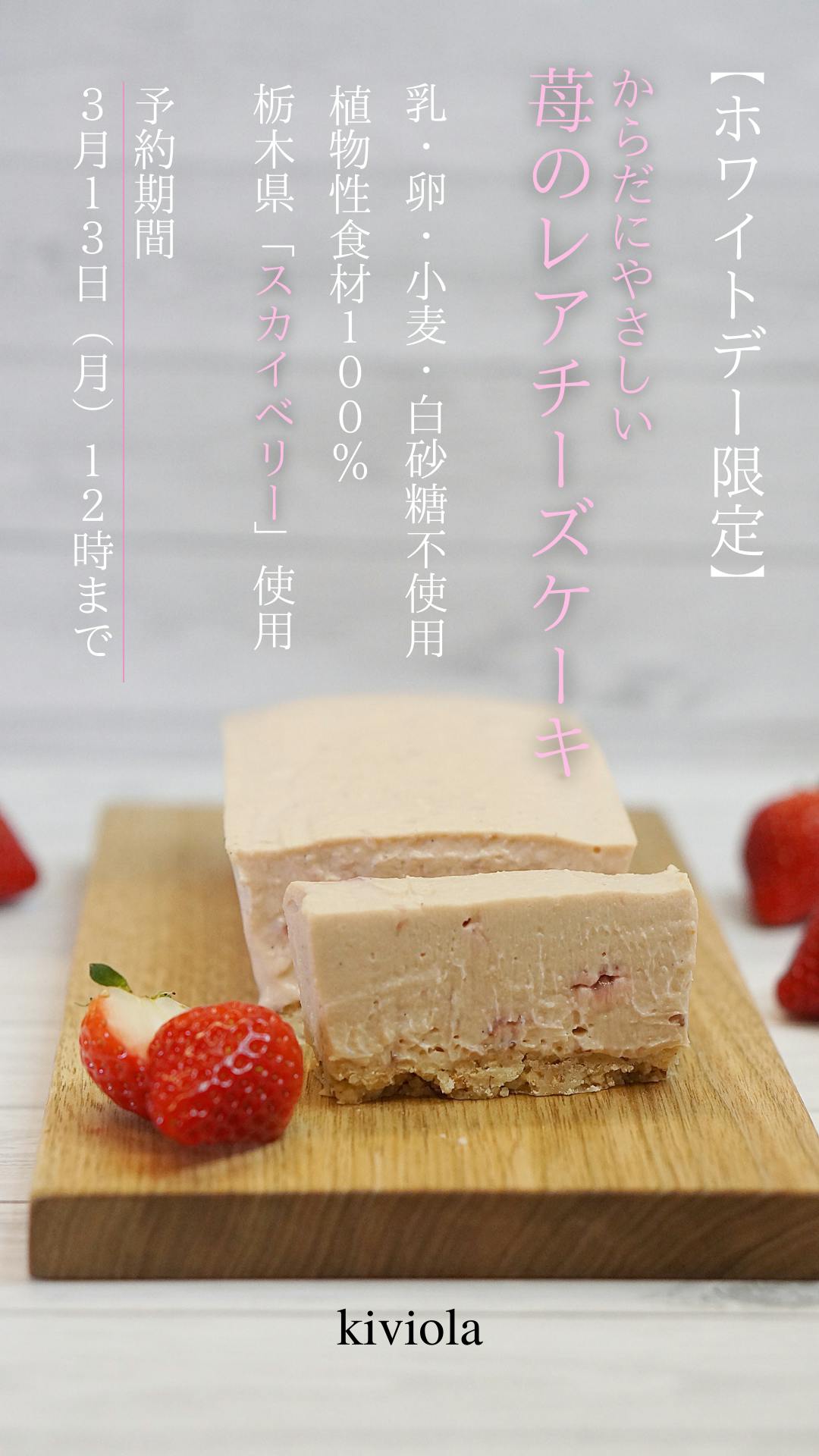 2023/02/28 12:19【ホワイトデー限定苺レアチーズケーキ】予約販売開始のお知らせこんにちは。今回はバレンタインのチョコレートチーズケーキに続き、ホワイトデー限定でkiviola初のレアチーズケーキが登場です!これまでの濃厚な味わいのベイクドタイプに比べて、ふんわり軽くてさっぱりとした味わい。今回は栃木県のいちご「スカイベリー」を使った爽やかないちごのレアチーズケーキ。スカイベリーは大粒で、酸味が少なく上品な甘さが特徴のいちごです。その大粒のいちごを甜菜糖、有機レモン果汁と共に煮込んでソースを作り、生地に混ぜ込みました。ソースは敢えていちごの果肉感を少し残すことで、味と見た目のアクセントになっています。さらに化学農薬に極力頼らないIPM栽培にて育てている農家様のいちごを使用することで、今回もkiviolaのコンセプトであるからだにやさしいケーキを目指しました。バレンタインのお返しやご家族・ご友人へ、気持ちの伝わるホワイトデーの贈り物としてご利用頂ければ幸いです。もちろん、ご自身のお楽しみとしてもぜひお召し上がりください!からだにやさしい苺のレアチーズケーキ---------------------------3月13日12時までの予約販売です。発送は3月6日〜13日を予定しております。※お届け日時のご希望は備考欄にご記入ください。※3月10日以降のご注文は3月13日午後に発送いたします。--------------------------- もっと見るチョコレートチーズケーキ 販売期間延長!