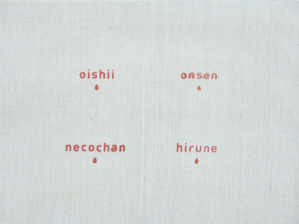 首紐は、アーユルヴェーダの生薬「インド茜」で手染めしました。シルクスクリーンの文字の色とお揃いなんですよ。