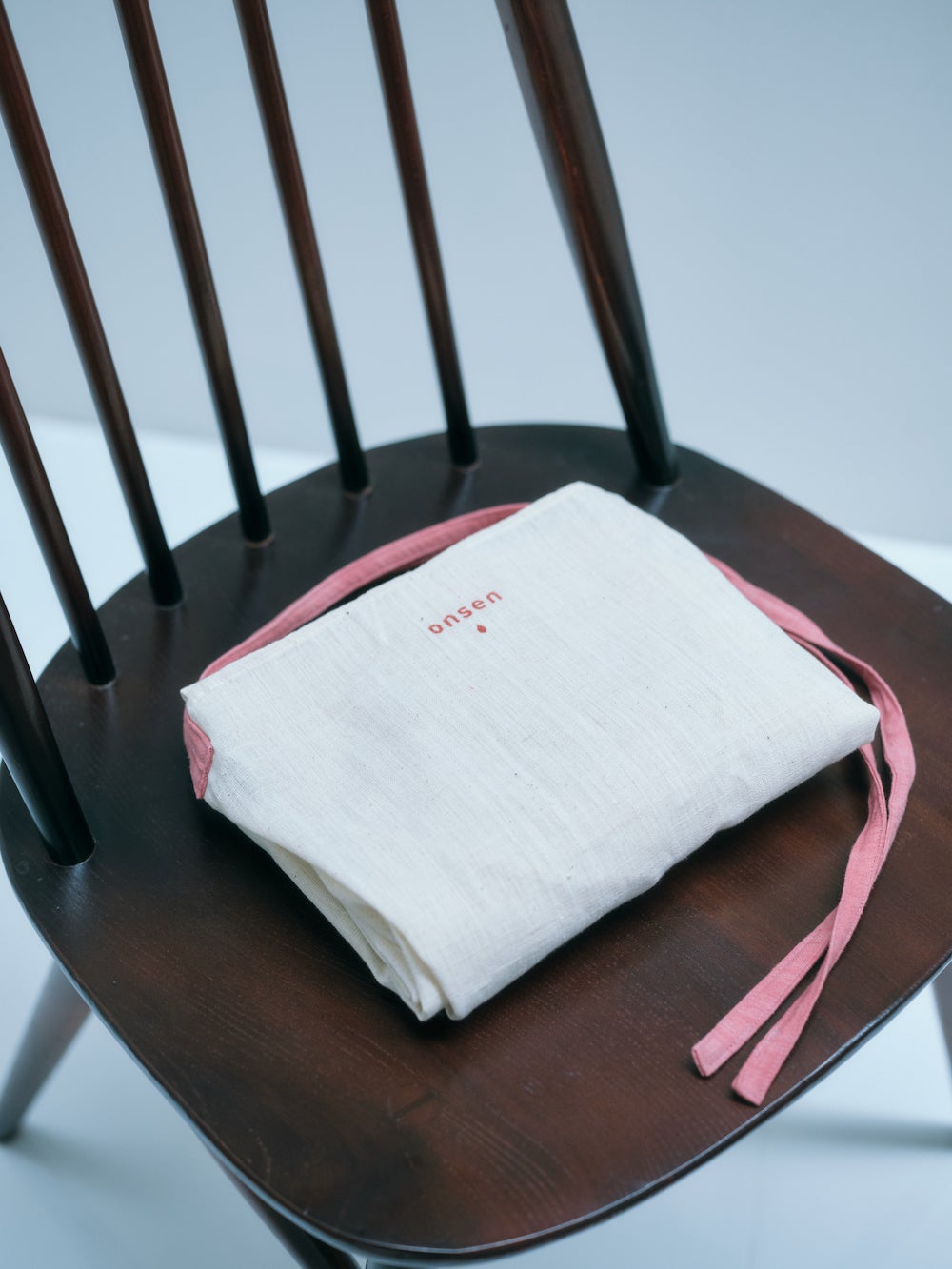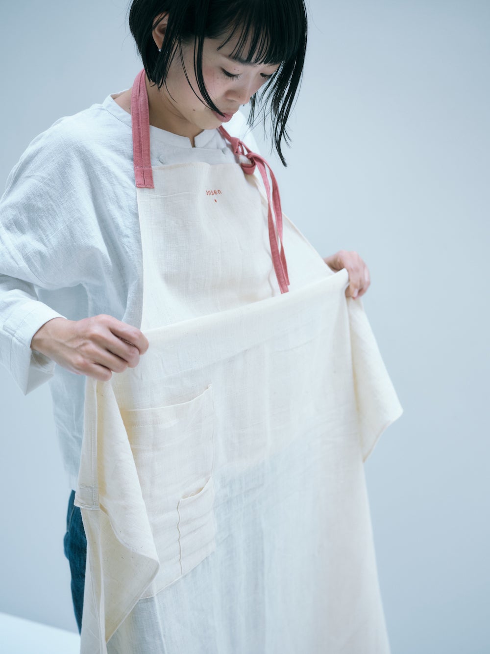 エプロン作りは「料理をしている時もしていない時もずっと身につけていたくなるくらい、軽い」ことにこだわりました。素材はインドの手紡ぎの生地「カディ」新品だとパリッとしてますが一度洗えばガーゼのように柔らかく、身につけると5月の風のように軽やかです。