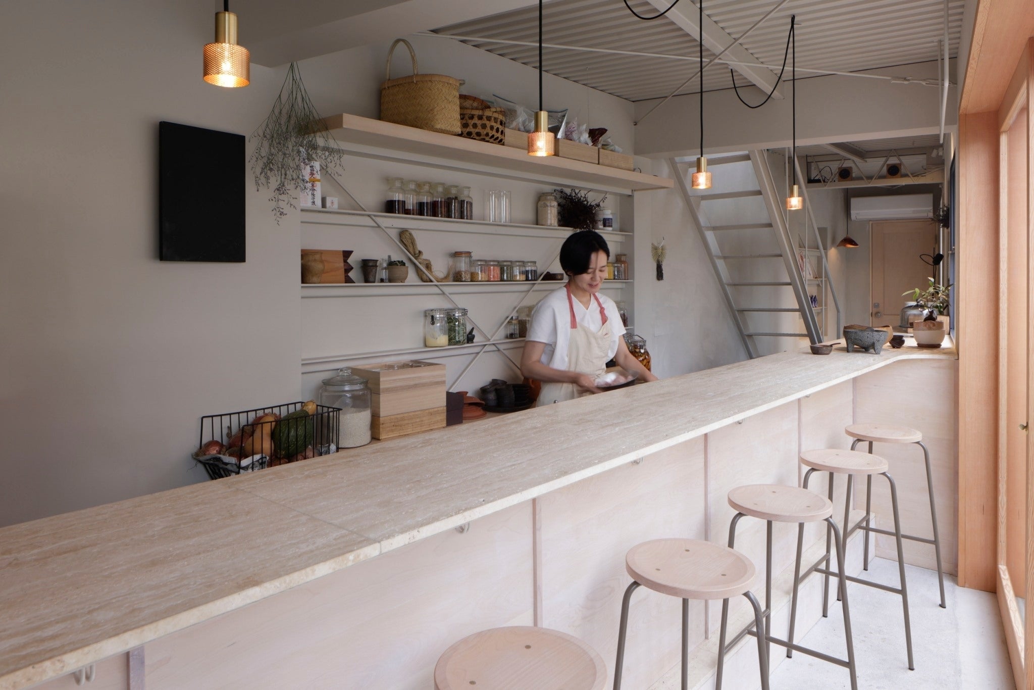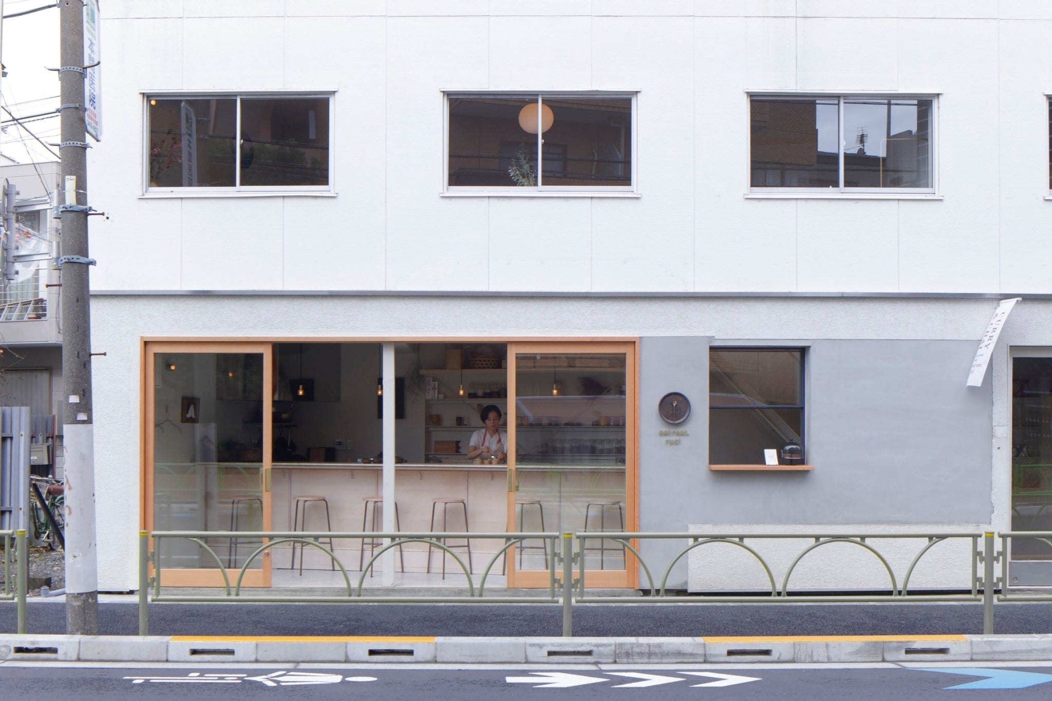 eatreat.の新店舗は真っ白な2階建て。一見すごく広そうに見えますが実はとても細長い物件なので笑、設計士は本当に苦労して席を作ってくれました。1Fがカウンター6席、2Fがテーブル8席で、見事な空間設計の工夫のおかげで狭さを全く感じさせない伸びやかな店内です。