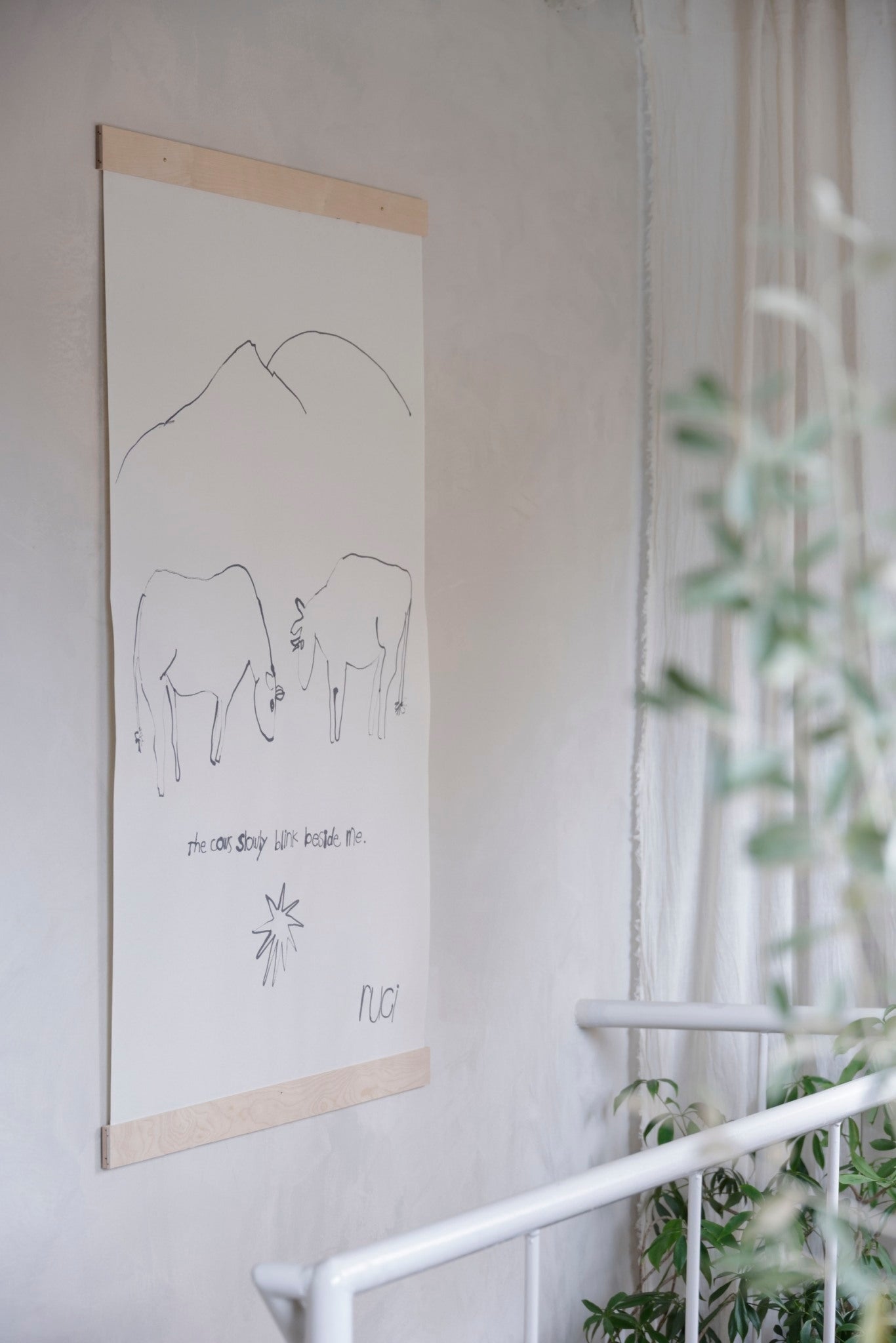 2Fに行く途中の階段上には、本の絵を担当してくれている伊藤眸さんがお店のために描き下ろした一枚の牛の絵もあります。この絵の制作にあたって、私から眸さんにある一編の詩を渡し、それを読んで眸さんが描きました。