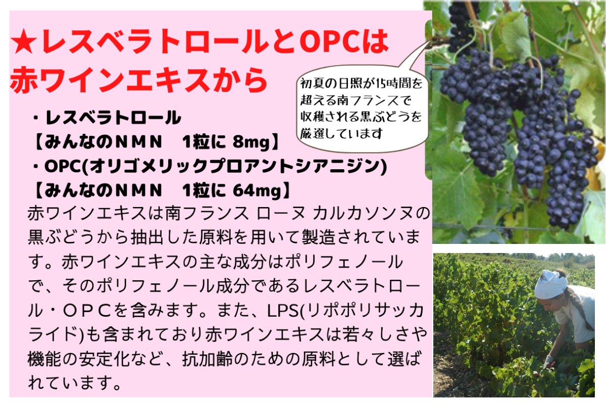 ★NMNにレスベラトロールとOPCを含むフランスの赤ワインエキスも配合