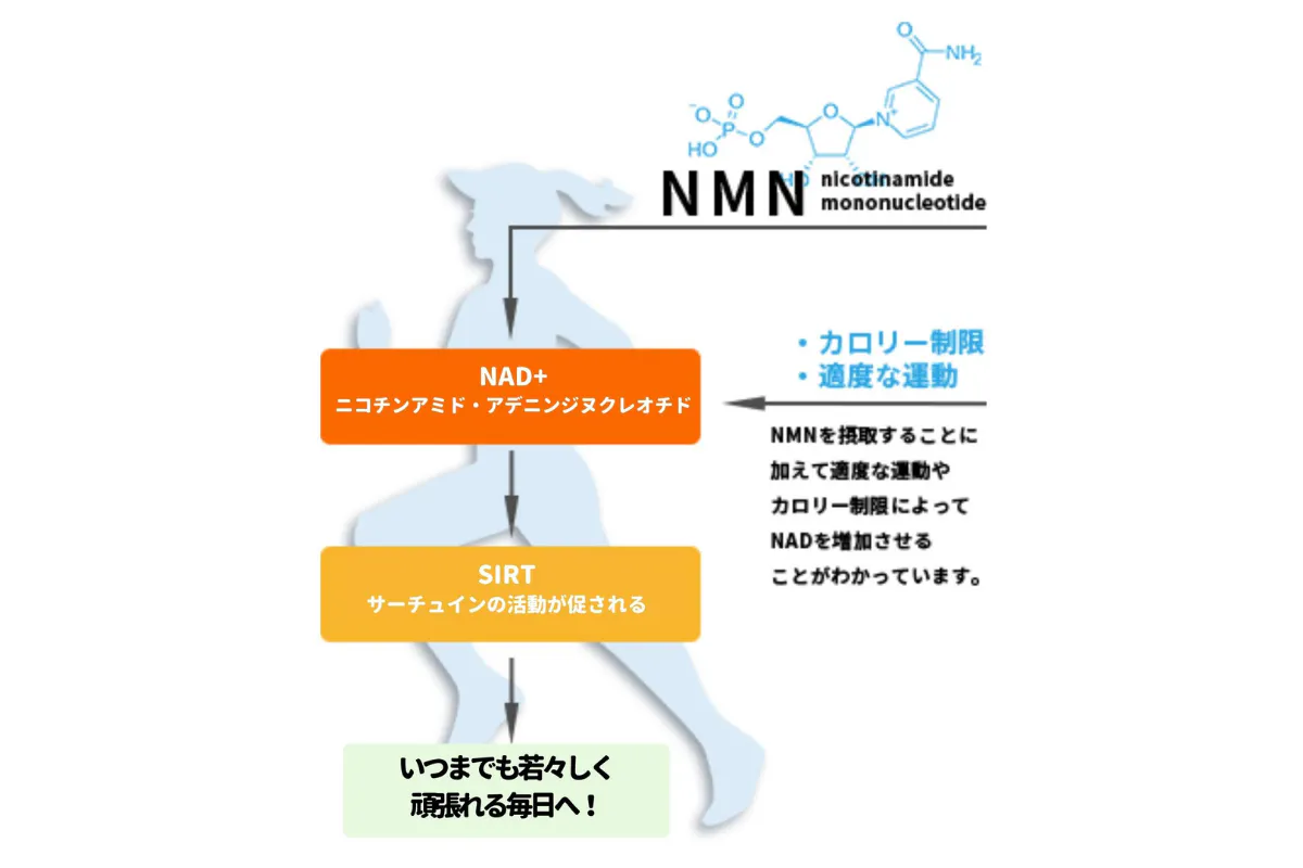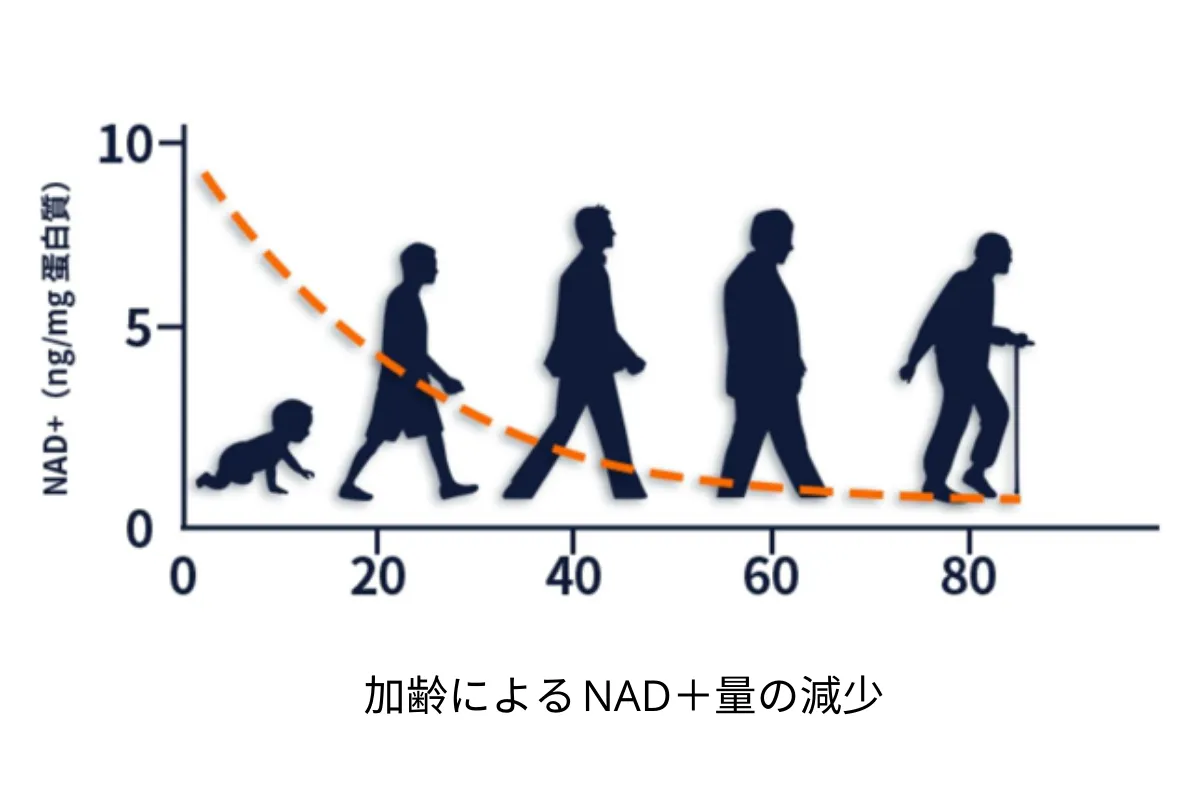 NMNの研究で加齢と共に体内での合成が下がってくることが判明しています。NMN合成の減少と共にNAD+の量も減ってくるのです。若々しさやコンディション維持など、加齢と共にNMNを補うことがキーポイントとなります。