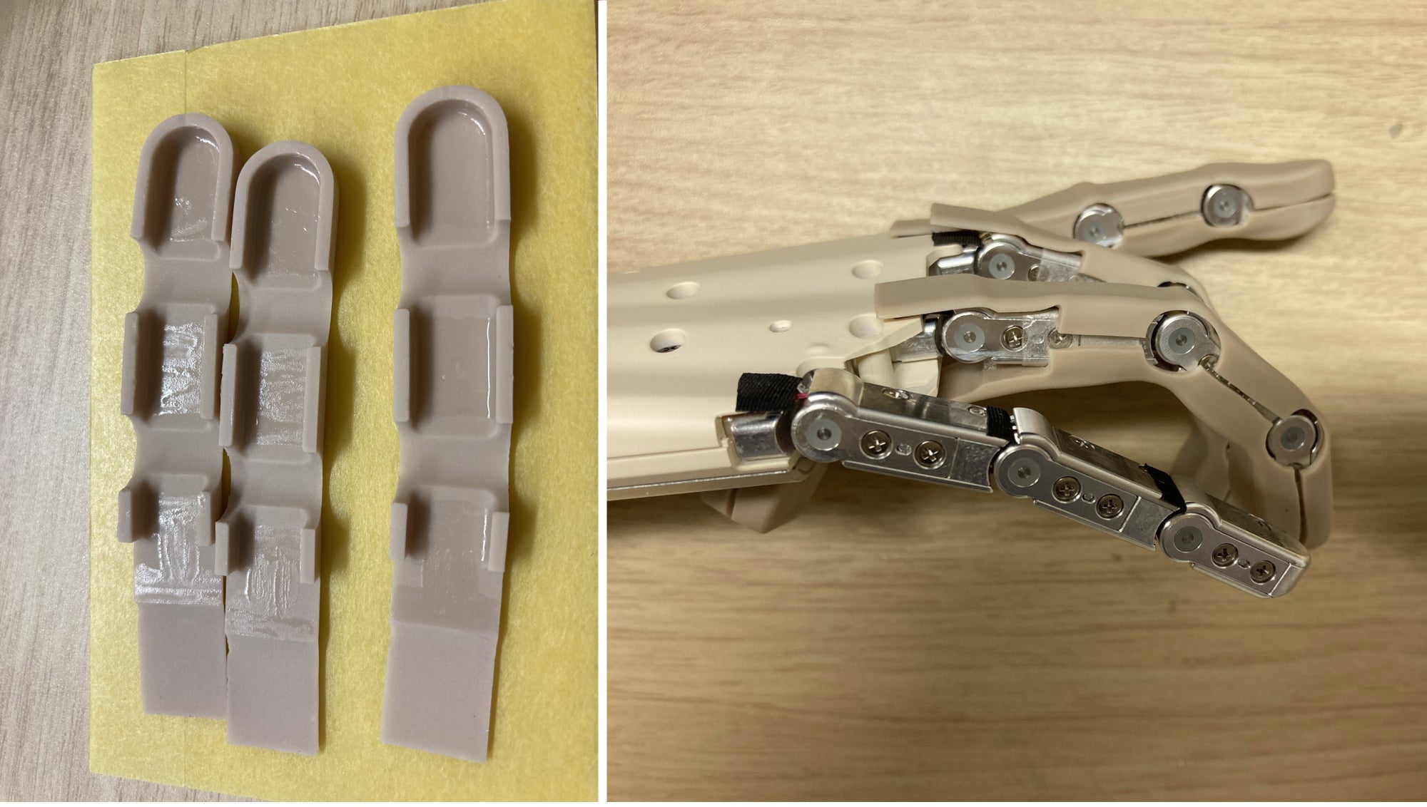 柔らかい感触を表現するために、固すぎず、柔らかすぎない肌の感触に似せた「ゲル」を製作しました。「層を厚くすると、手を大きく感じてしまう」、「層を薄くしすぎると、握った際に人間の骨にあたるロボットの骨格を感じる」といった課題がありましたが、感触や肉厚を調整して絶妙な感触を再現しています。