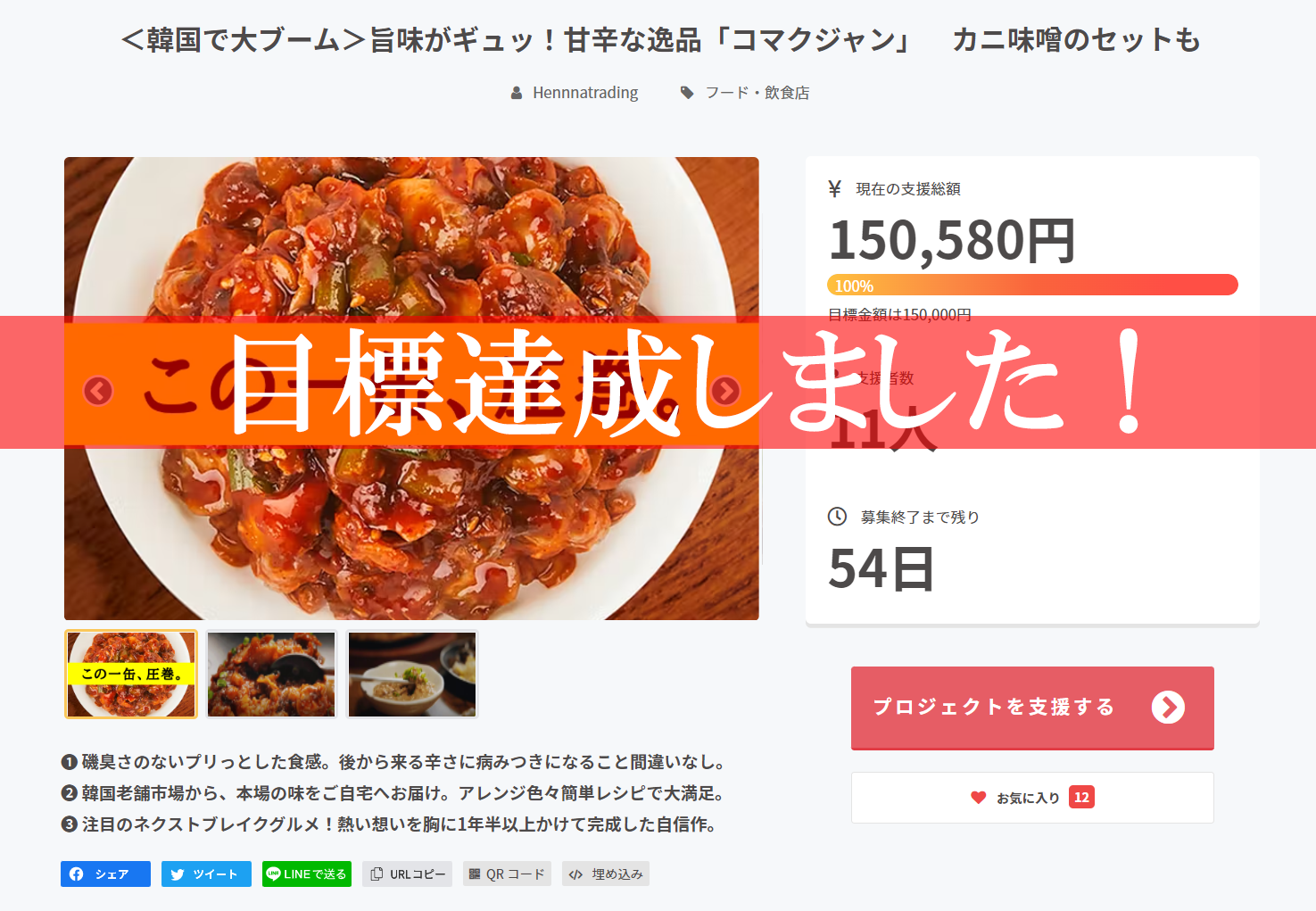「<韓国で大ブーム>旨味がギュッ!甘辛な逸品「コマクジャン」 カニ味噌のセットも」プロジェクトをご覧いただき、またご支援いただきありがとうございます!!