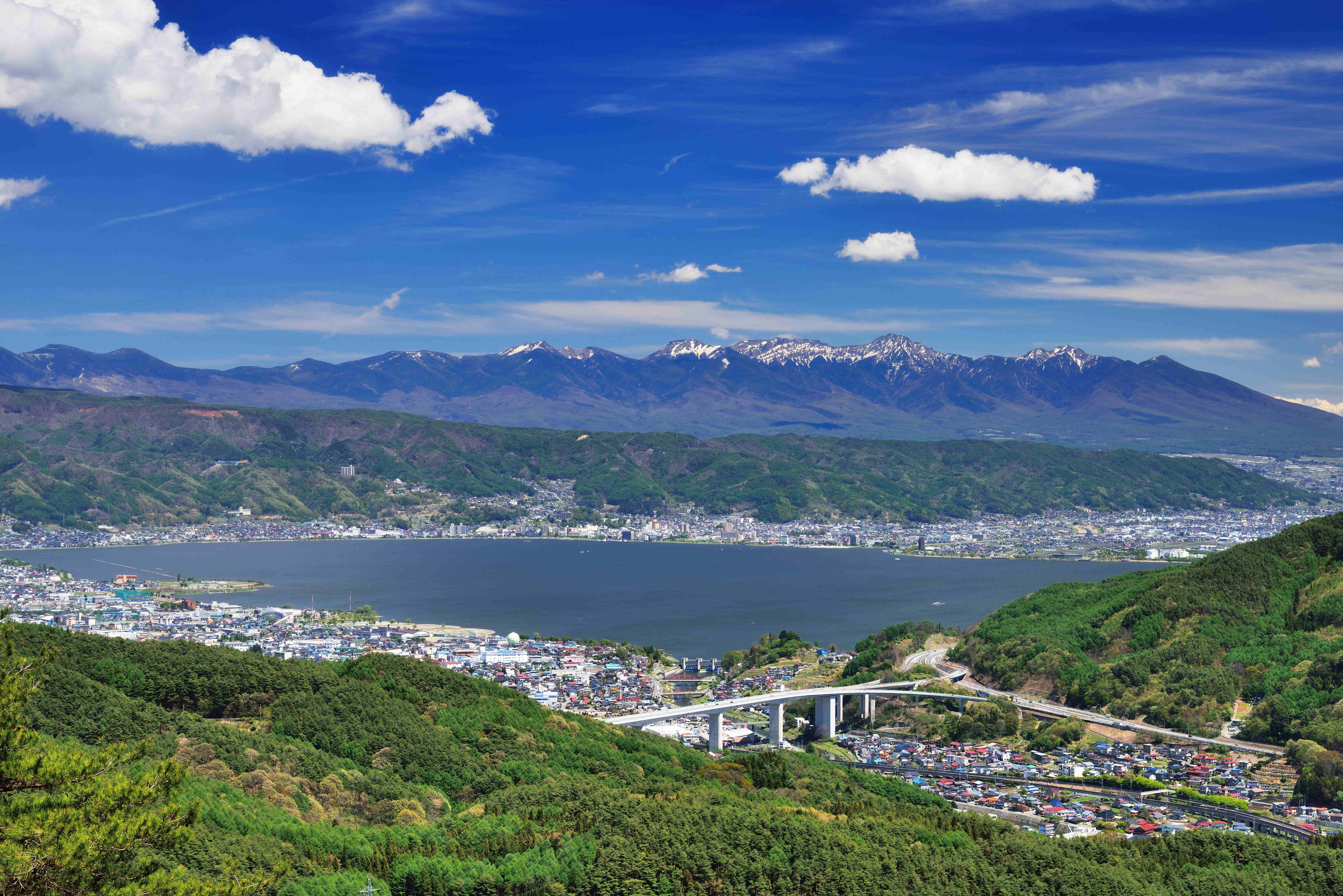 岡谷市は長野県のほぼ中央にある諏訪湖の西岸に面しています。西北には塩嶺王城県立公園、東には八ヶ岳連峰、遠くには富士山を望む、湖と四季を彩る山々に囲まれた風光明媚な都市です。また、諏訪湖唯一の流出河川「天竜川」がここから流れ出していて、遠く浜松まで続いています。