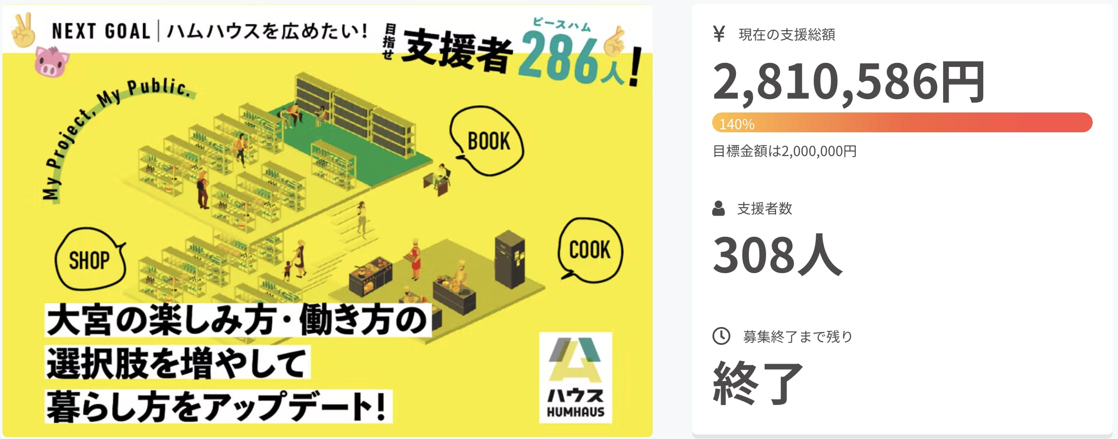 2022/04/11 10:39皆様、こんにちは。ハムハウス株式会社の宮本恭嗣です。この度は、たくさんのご支援、本当にありがとうございました!最終的には延べ308名の方に、2,810,586円というご支援を頂きました。200万円&200名という高い目標設定で、本当に達成できるか不安でしたが、多くの方のご支援&シェアのおかげで、金額&支援者数とも目標を大きく上回ることができました。特にNEXT GOALとして設定した支援者数286名を残り4日間という短い期間で達成できたことが何よりも嬉しい驚きでした。まだ何も始まってないハムハウスに対して、こんなに多くの支援・期待・共感を得られたことは、僕らにとって大きな力となります。と同時に既に300人規模のプロジェクトになっていることにちょっとビビってます…とにかく、300人のハムな人という仲間を得て、ここからがスタートですので、皆さんの期待を裏切らないよう、取り組んでいきたいと思っています。今後のハムハウスの動きですが、4月末のハムブックのプレオープンを目指して、急ピッチで工事を進めているところです。ショップとキッチンも順次オープンさせて、遅くとも7月頃までにはグランドオープンできたらと考えております。今後の活動報告は下記のFacebook等のSNSとWebサイト(作成中)にて発信していきますので、フォロー頂ければ嬉しいです。※Facebookページhttps://www.facebook.com/humhaus.jp※Instagramhttps://www.instagram.com/humhaus.jp/※Webサイト(作成中)http://humhaus.jp/最後に改めて、ご支援頂いた皆さんには心より感謝申し上げます。皆さんの想いや期待をしっかりと受け止めて、ハムハウスを大宮の楽しみ方・生き方の選択肢を増やして暮らし方をアップデートする場として育てていきたいと思います。これからも見守って頂ければ幸いです。オープンした暁には是非遊びに来てください。皆さんに直接お会いできるのを楽しみにしております。本当に本当にありがとうございました!ハムハウス株式会社代表取締役 宮本恭嗣 もっと見る