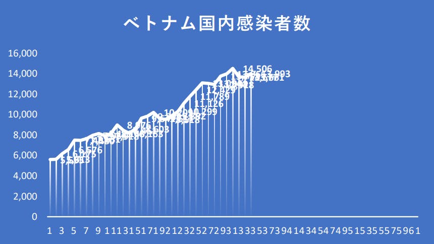 ベトナムでは2020年7月よりコロナパンデミックが続き、南部では2021年3月頃よりロックダウンとなっています。5月地点では新規感染者数は200人前後でしたが、現在ではクラスターや変異株による影響により、1日辺りのコロナ感染者数は12月6日地点で14,591人まで急増しました。下記はベトナムのコロナ感染者数を示したグラフです。