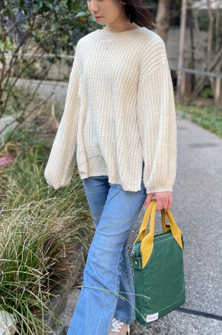 off on'sカフェバッグの大きな特長の1つが、デザインのアクセントに「杉綾織」を加えていることです。杉綾織は綾織の中でも特に杉の模様に見える、立体的な模様が特徴的な独特の編み方で、直線でも味わい深いのですが、曲線で用いると不思議なグラデーションを感じさせます。