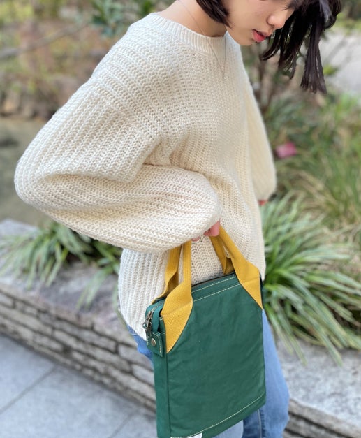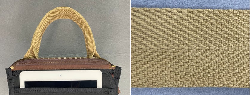 そして、杉綾織のすごいところはその模様を手で触って感じることのできるところです。模様ではなく織り目であるため、その筋1本1本を触って感じられるのがとても心地いい。そして、カフェバッグはなんとこの杉綾織を持ち手に採用しました!