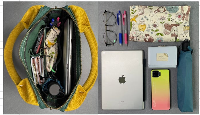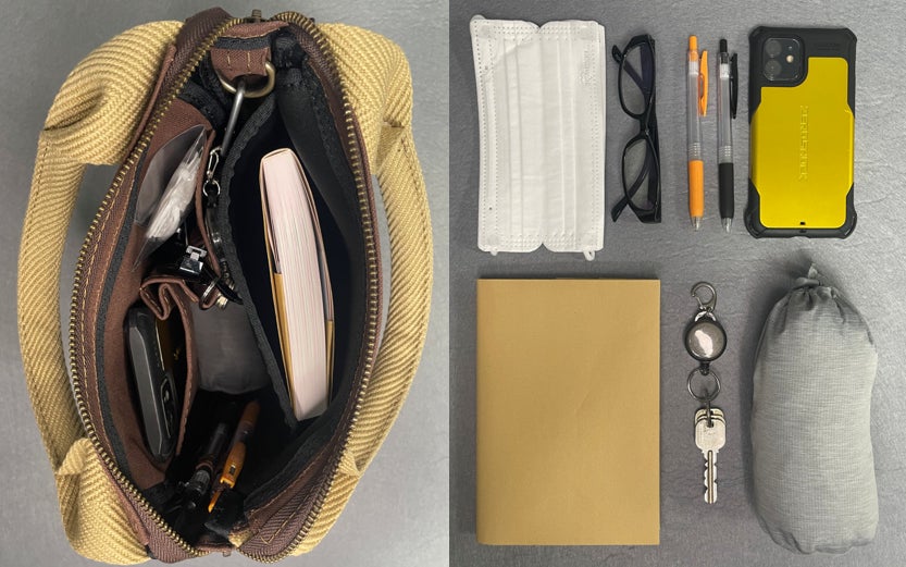 A:私は、本とA5ノート、ペン2本・ICカード・予備用マスク・スマホ・コンパクトパーカー・名刺入れを入れています。基本的には、入れっぱなしです。財布はズボンポケットに入れる派です。