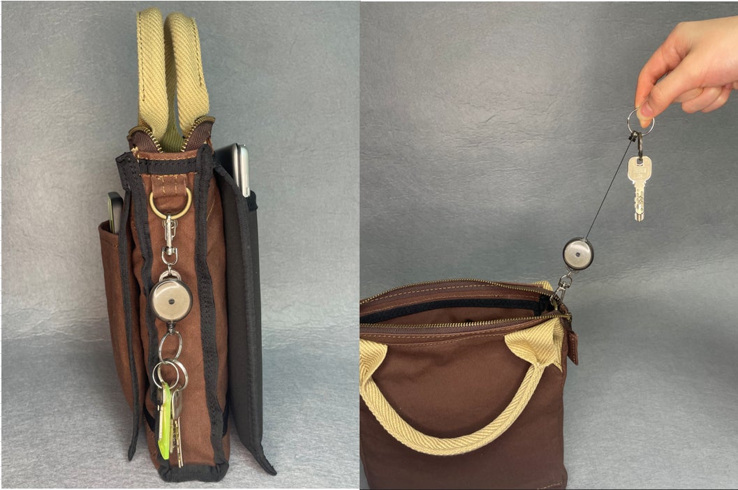 キーホルダーなどを掛けることができる金具です。タブレット/本やスマホ/財布と別のポケットにある構造のため、それらを痛めることがありません。リール付のキーチェーンを使うことで、鍵を簡単に取り出してから収納することができるため、鍵をなくす心配がありません。