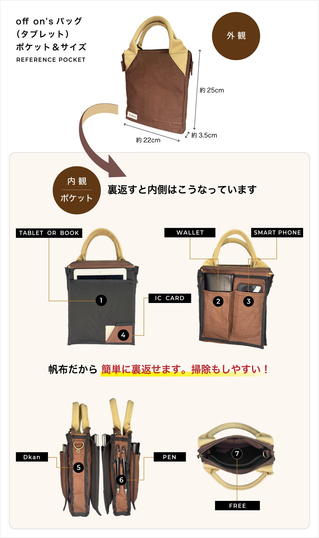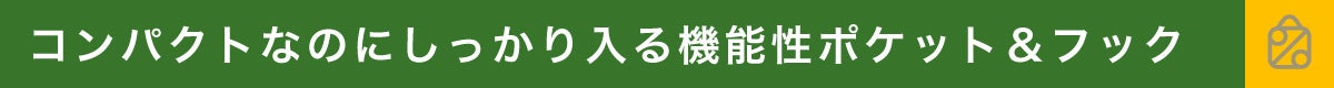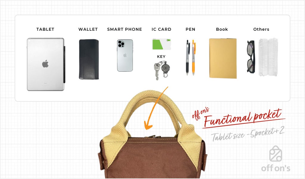 off on'sのカフェバッグは、5つの機能性ポケットと2つの機能性フックを備えています。しっかり入るよう計算されたデザインだから、コンパクトなのに思ったよりもしっかり入ります。通勤・休日などのちょっとしたお出かけにも便利に使えますね。