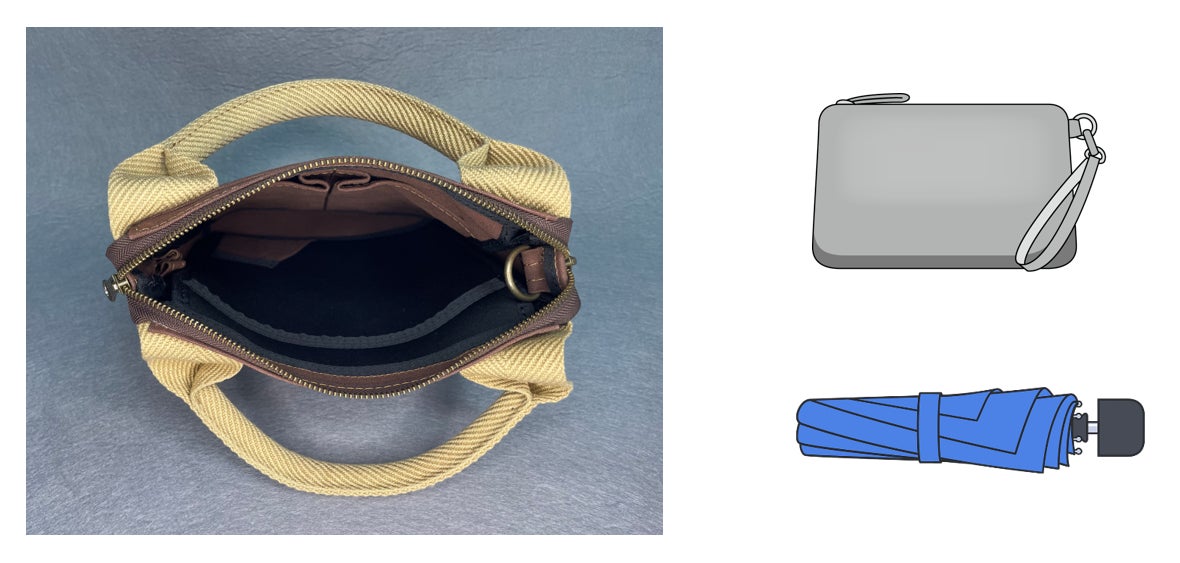 A:一番好きなのが持ち手の感触です。「杉綾」という織り方だそうです。初めて持ちましたが、ちょうどよい凹凸感で、持つたびにざらっとした感覚が楽しめています。本体生地は帆布なので、時間が経ち、少し風合いも馴染んできたような気がします。あまり傘を持たないので、急な雨でも多少はじいてくれるのは助かりますね。