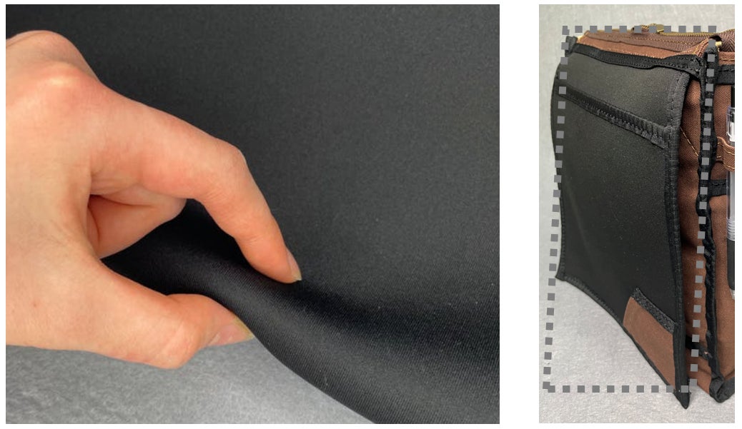 スマホ・タブレット・ノートブックPCなどの電子機器を、浸水や衝撃から守れる素材を探し、たどり着いたのがウェットスーツで用いられる高クッション素材の「ネオブレン」です。耐水性・耐摩耗性・伸縮性があり、湿気を通しにくい性質も電子機器の保護に役立ちます。