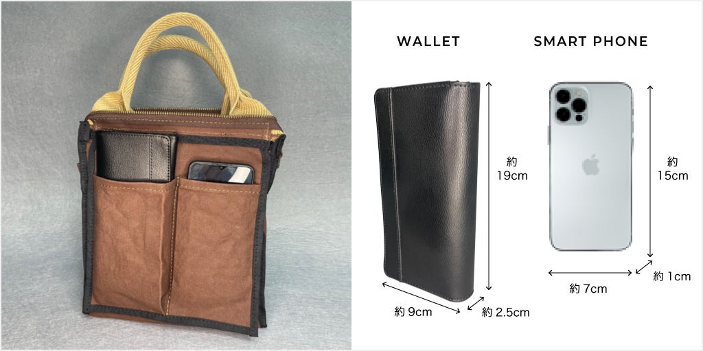 ポケットは2つとも同じサイズです。マチを広めに作っているため、長財布や折り畳み財布も入ります。下記のサンプル写真では、左ポケットに厚手の長財布(中身を入れて厚さ約2.5cm)を収容しています。右ポケットにiphone12(スマホケースなし、78×161mm)を収容しています。他にも、メモ帳・名刺入れ・眼鏡ケース・マスクケース・ハンカチ・ティッシュも入れてもよさそうです。