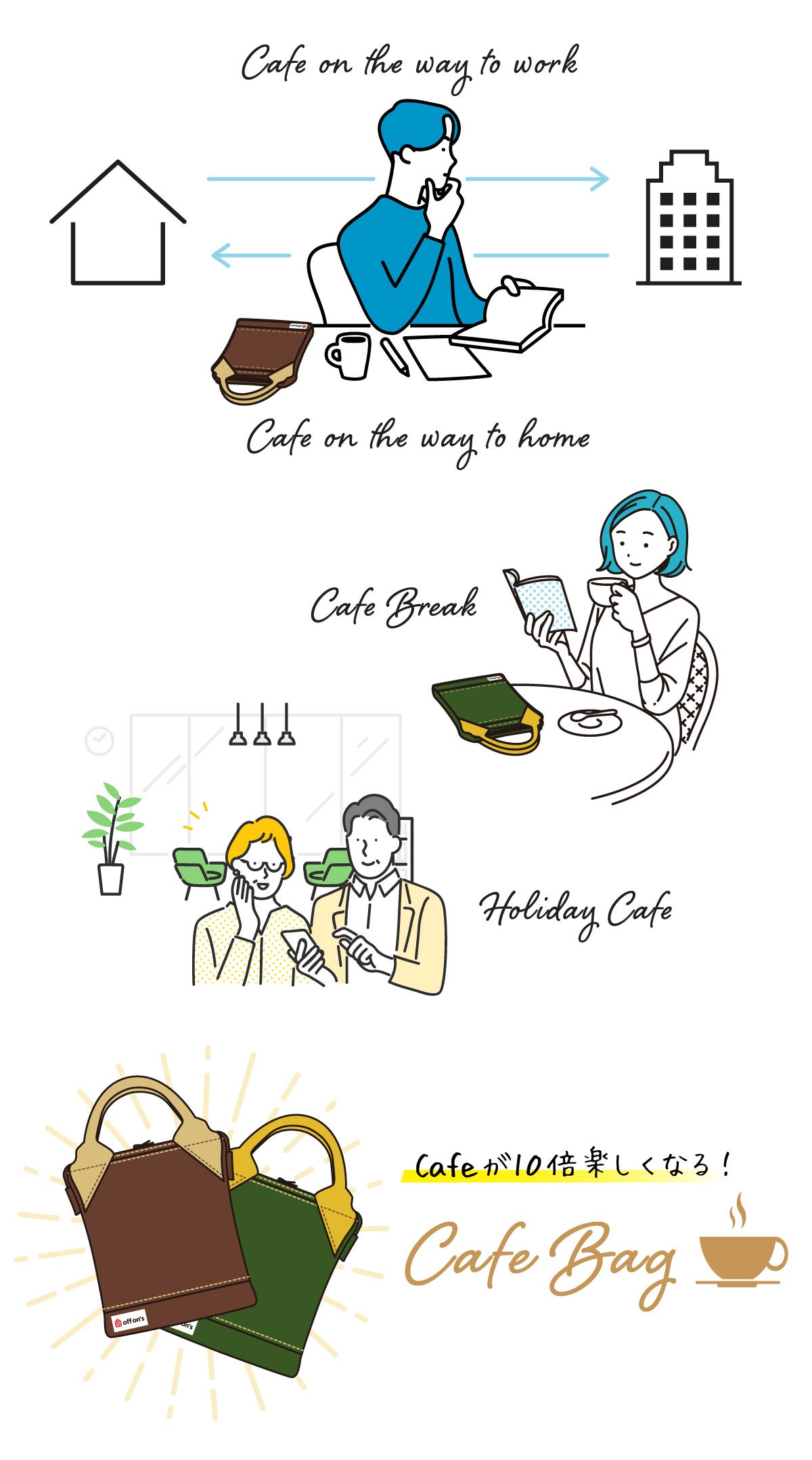「今」この大変な時代を生きる私たちは、いつも心が緊張しています。そんなこわばった心を「ほっ」とほぐしてくれるのが「今日、1杯のCafé Time」。off on’sのカフェバッグは、Cafeに行くあなたといつも一緒です。