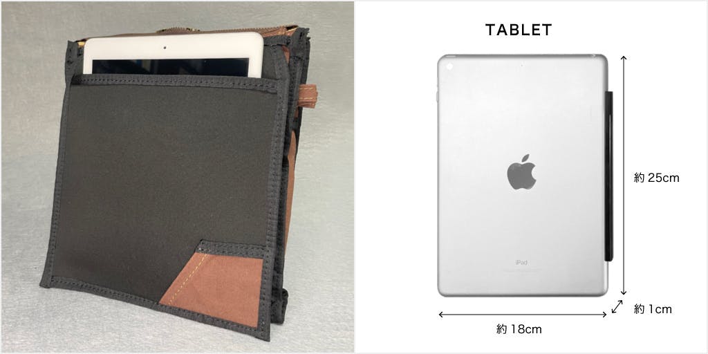 ipadなどの10.2inchタブレットやA5判本(148×210mm)サイズが少し余裕をもって収まるサイズです。少々分厚い本でも入り、薄い本+タブレットも入ります。少し縦長の造りであるため、本の上部が痛むことが少ないです。