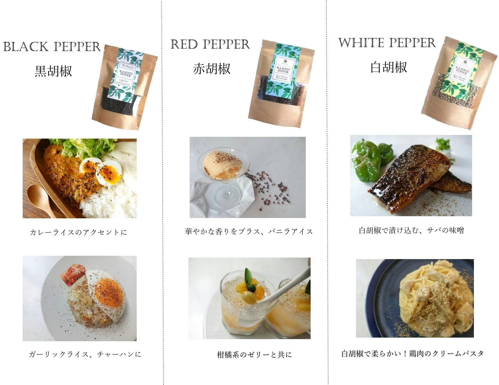 カンポットペッパーは独特の『旨味』を持っている胡椒で、カンポットペッパーの胡椒一つでどんな料理の味もまとまります。胡椒自体にうまさがあり、チャーハンや炒め物などの火を通す料理からサラダやカプレーゼなどの火を通さない生の料理にも幅広い料理にお使いいただけます。