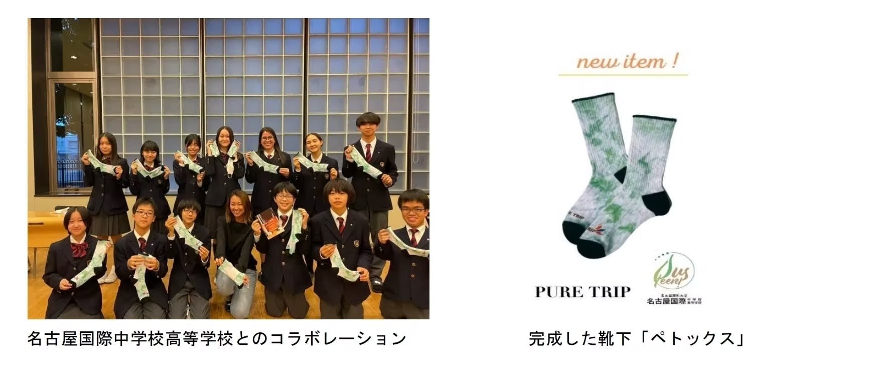 「PURE TRIP」では名古屋国際中学校高等学校のSDGS部とデザインをコラボレーションしており、飲食店の廃棄野での染め物をし、靴下のデザインにしました。