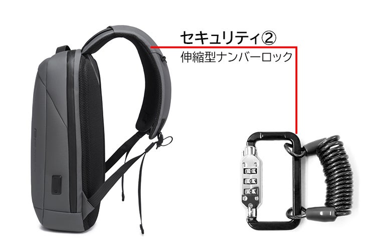 伸縮型ナンバーロックも付き、外出先で急に席を外しなければならない場合、椅子やテーブルにロックすることができ、安全性が高まります。
