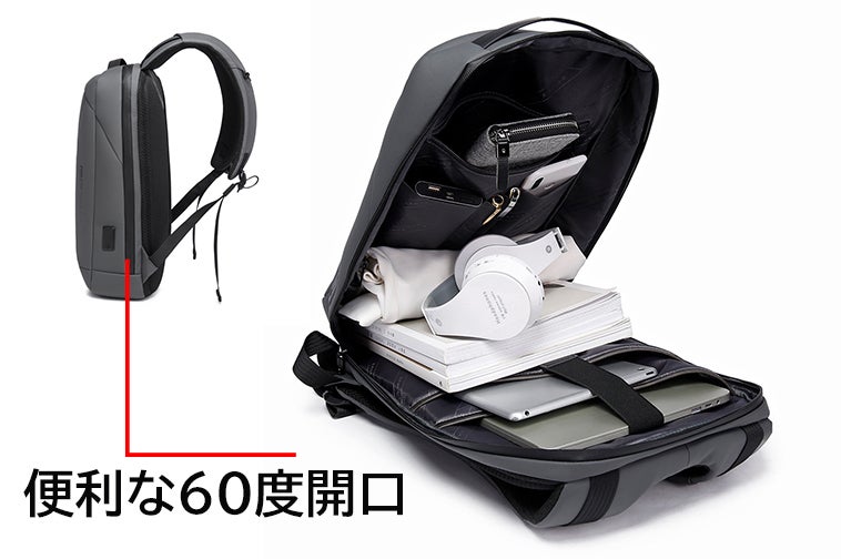 リュックはは最大60度まで展開可能なので、荷物の整理や物の出し入れは大変便利になります。