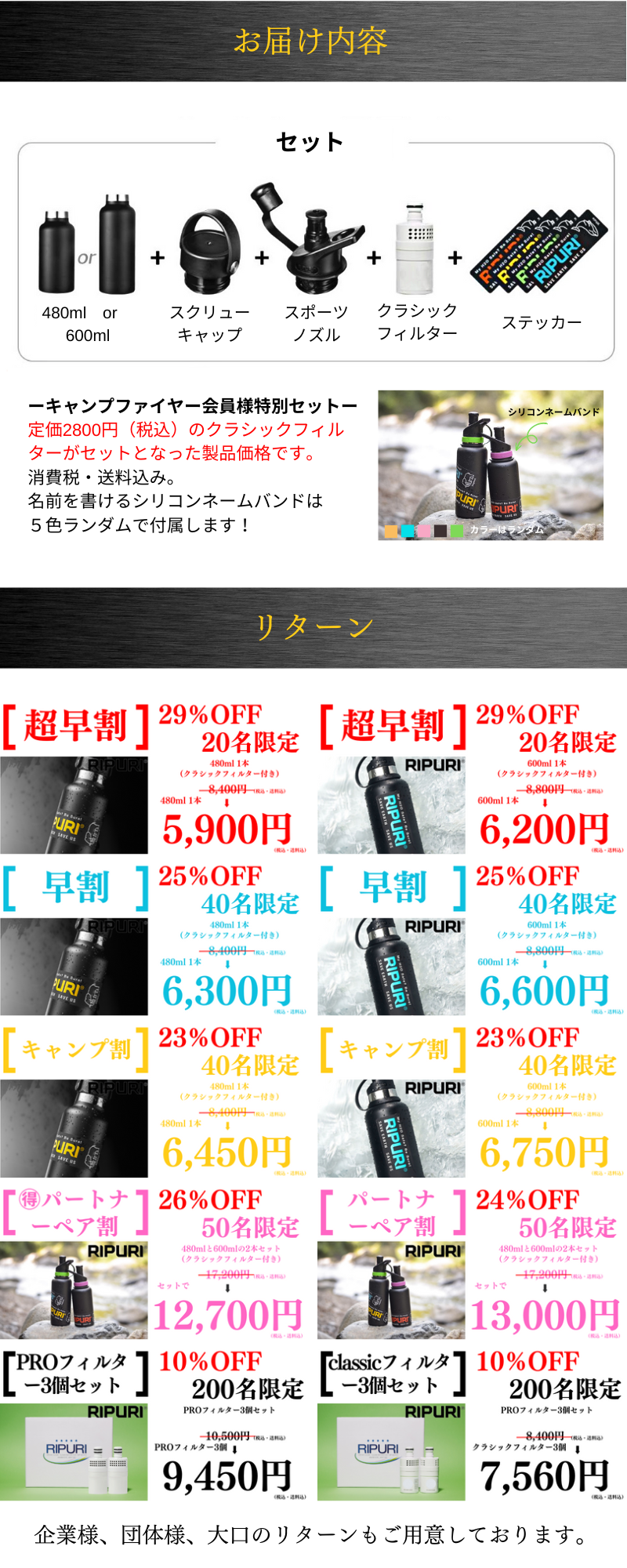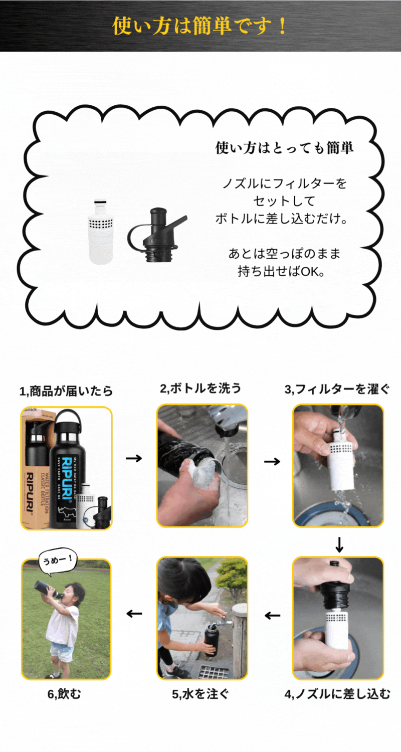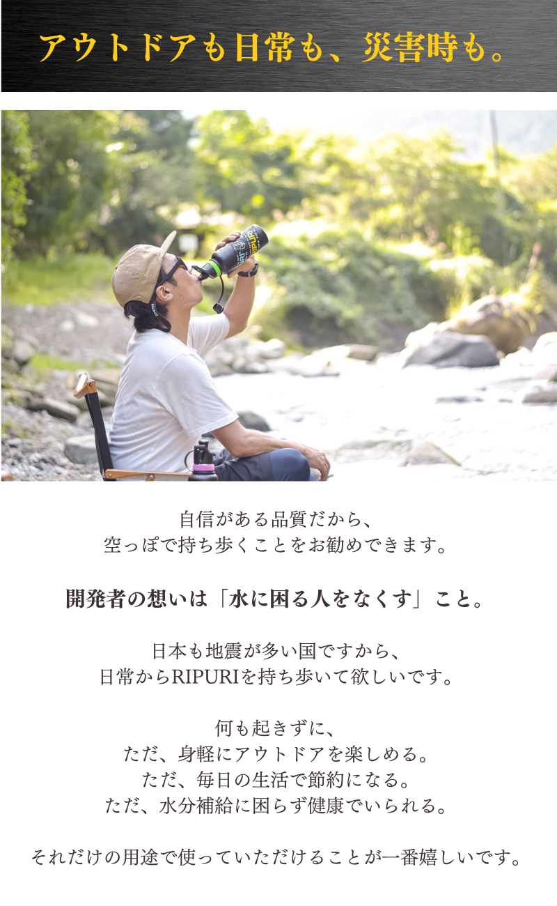 2023/04/30 18:00残り6時間で終了となります。3月11日、震災の日からプロジェクトをスタートさせていただき、RIPURIが少しでも皆様の必要となればと行わせていただきました。プロジェクトページの中にも記載させていただきましたが、3.11の日、首都圏では帰宅難民者が515万人もいました。その中の1人だった私は、コンビニに行っても水は売り切れ、、自動販売機も売り切れ、、、喉が乾いて仕方ない思いを経験しました。そんな中で見つけた商品がRIPURI(リプリ)です。メーカーは韓国にあり、「水に困る人をなくす」という理念で製品の研究の開発を行い続けている会社です。社長のジョン氏は、元アメリカのウォルマートに勤めており、世界中の国に出向く中で水をどこでも安全に飲める世界を作りたいと思ったそうです。ジョン氏は、現在はウクライナ、トルコ、シリアに向けて浄水ボトルの供給や開発の支援を行っています。そのような志の高いメーカーの思いを乗せて今回チャレンジさせていただきました。今後もより多くのお客様にRIPURIを届けていきたいと思っております。ご支援者の皆様、今後ともどうぞよろしくお願い致します。RIPURIでは、日本総代理店であるRIPURI JAPANが、公式LINEを開設しています。公式LINEでは、RIPURIの最新情報やお得なキャンペーン情報、フィルターの使い方や交換時期などの質問に迅速にお答えするサポートを行っております。ぜひ、この機会にご登録いただきまして、長くご愛用いただければと思います。RIPURI JAPAN公式LINEは→https://s.lmes.jp/landing-qr/1657113165-pEyJmEZ3?uLand=zkD5YG もっと見る