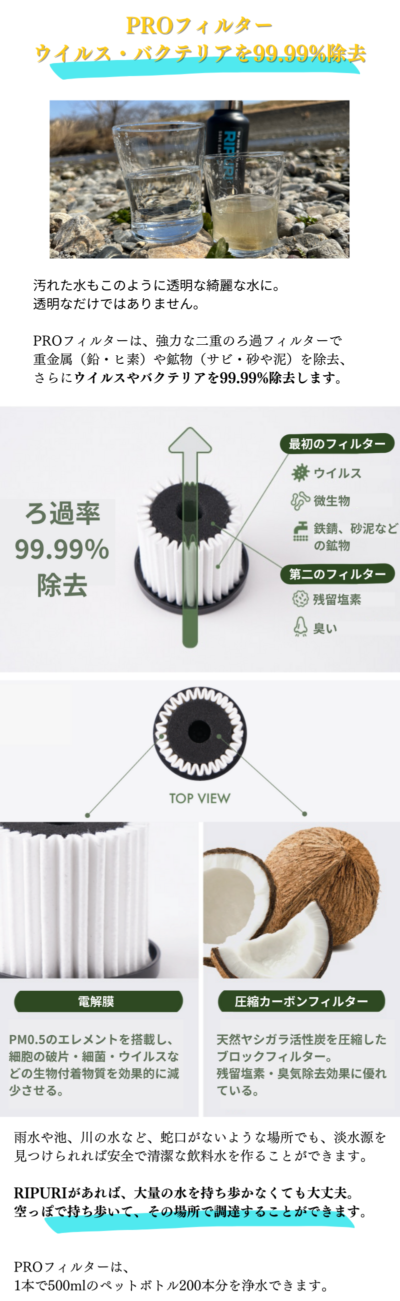 PROフィルターは、極端に水が汚れている場合、泥やゴミを沈殿させてから上澄の水を救いRIPURIでろ過するようにした方が、フィルターが目詰まりを起こさず長持ちします。目詰まりを起こした場合は交換してください。