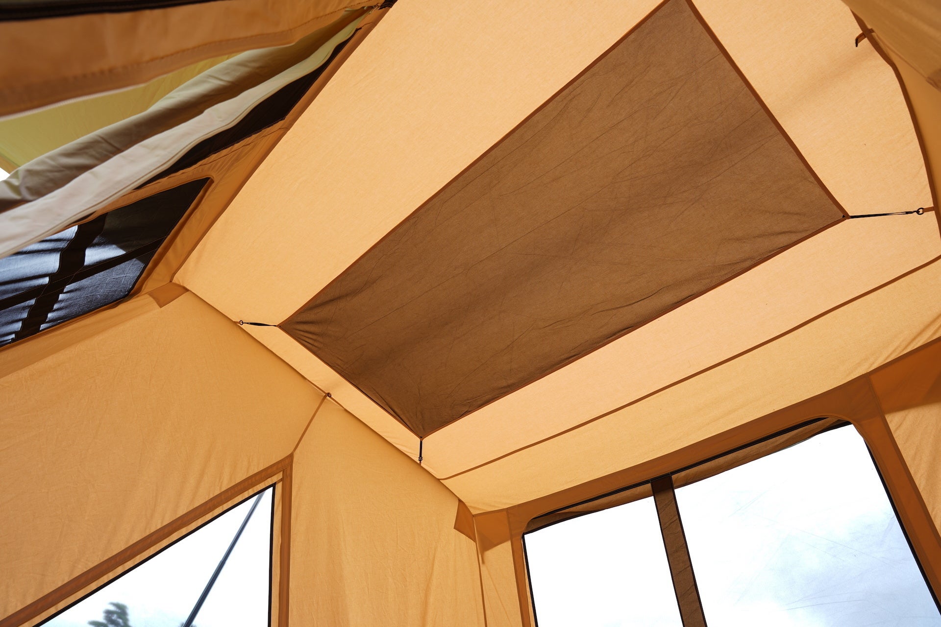 ドアを開き、テント内部に空気が入るようにしながら、テントを建てます。