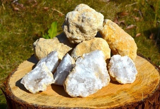 ジオードとは?数百年~数千年前にマグマの空洞内にできた晶洞のこと。外見はただの石の塊、その内側に隠されたキラキラ輝く群晶の世界が、好奇心をくすぐります。割って初めて知る神秘!